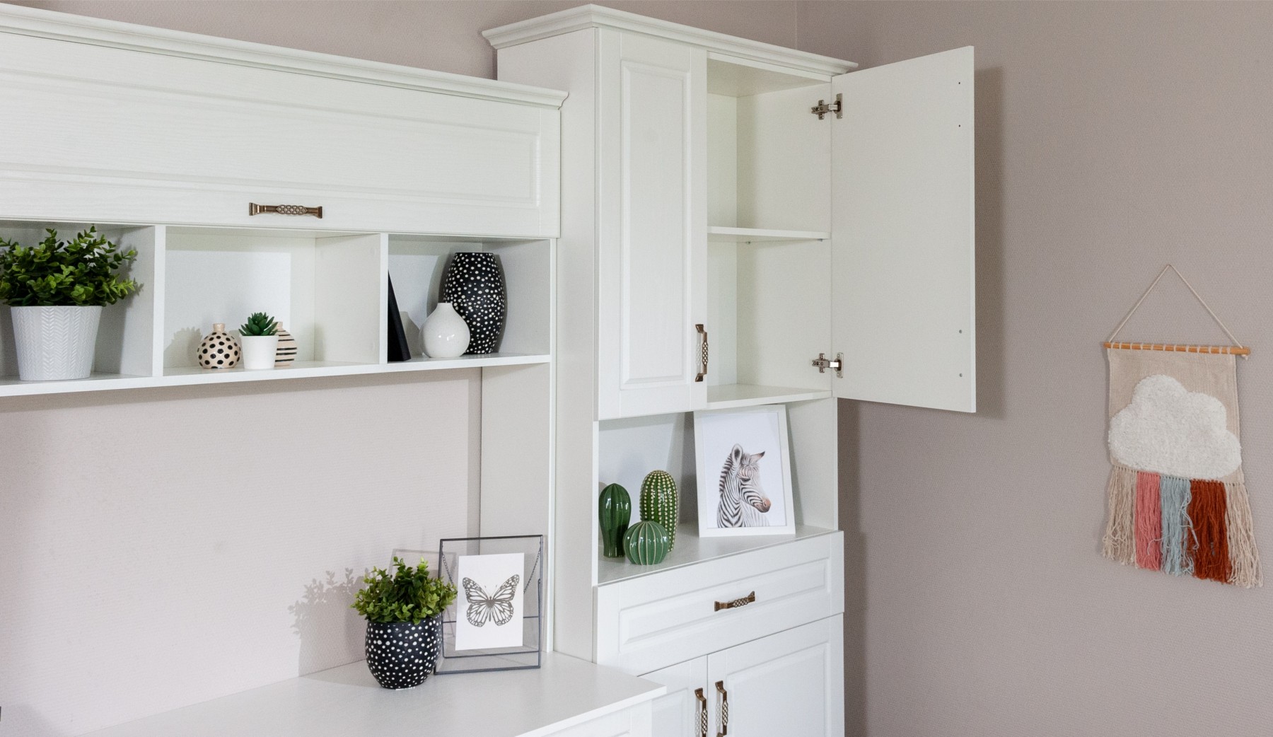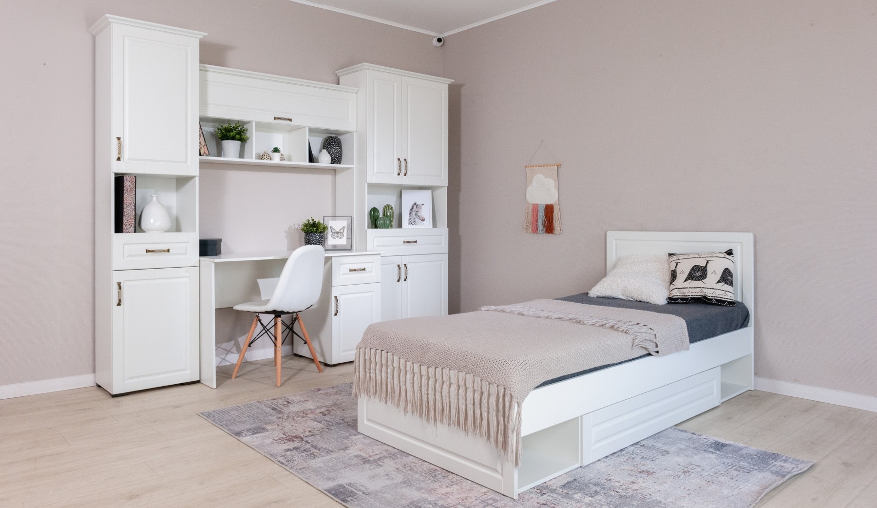 Лацио — это универсальное решение для обустройства комфортной зоны для игр, обучения и отдыха ребенка. Широкий выбор модулей позволяет оптимально обустроить детскую в зависимости от возраста и увлечений. Белый цвет фрезерованных фасадов из МДФ с текстурой дерева расширяют пространство, создают гармоничную и спокойную обстановку для ребенка. Мебель выполнена из ЛДСП и МДФ класса эмиссии Е1 — безопасное сырье, разрешенное к использованию в детских садах и школах.