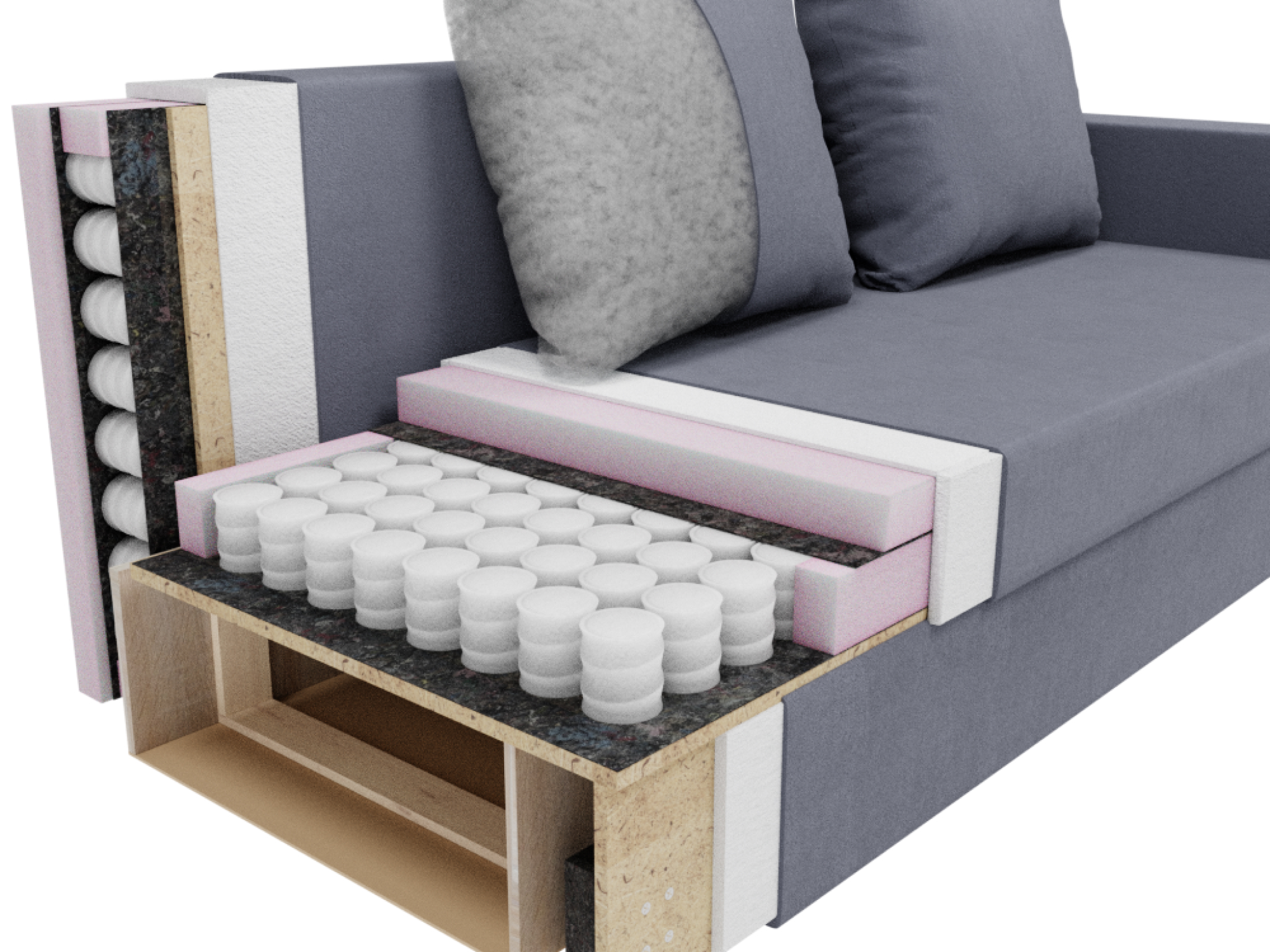 Наполнитель - пенополиуретан, который обеспечивает мягкость и комфорт при сидении. Каркас выполнен из ДВП, ЛДСП и массива дерева, что гарантирует прочность и долговечность изделия.
