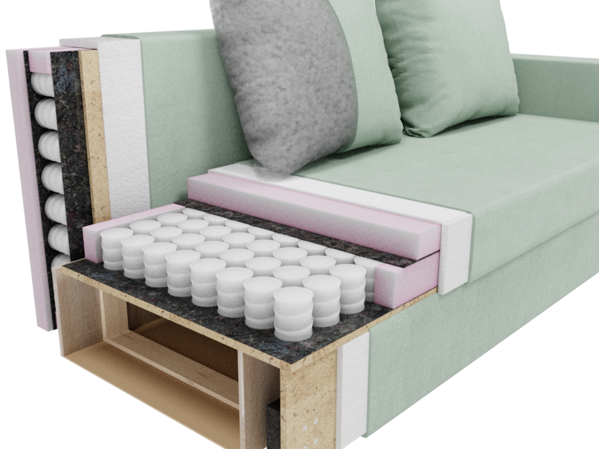 Наполнитель - пенополиуретан, который обеспечивает мягкость и комфорт при сидении. Каркас выполнен из ДВП, ЛДСП и массива дерева, что гарантирует прочность и долговечность изделия.