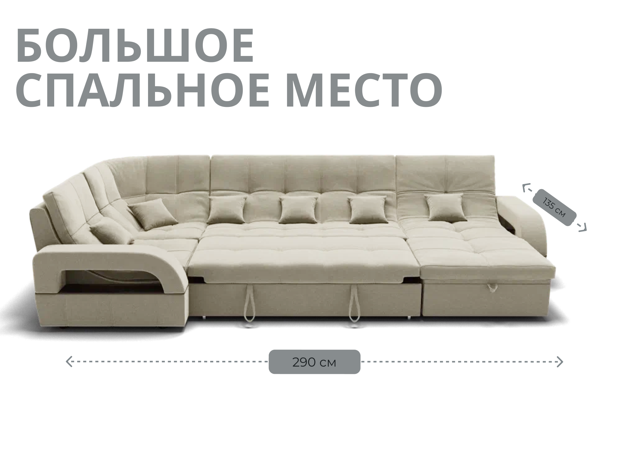Спальное место имеет ширину 135 см и длину 290 см. Он предназначен для двух человек и имеет глубину сиденья 65 см. Максимальная нагрузка на диван составляет 280 кг.