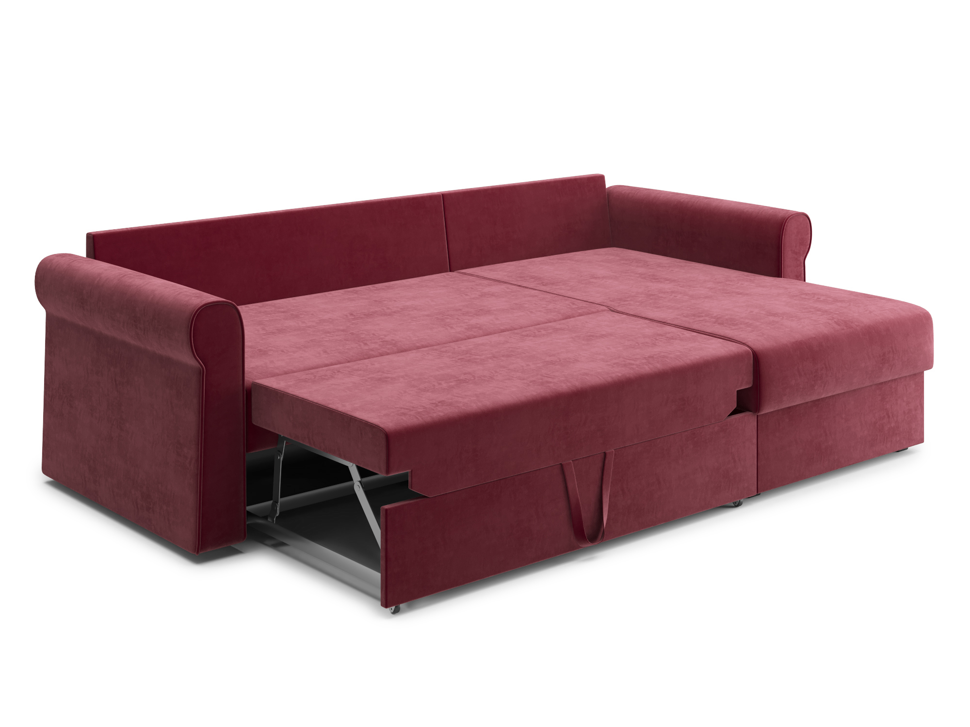 - Механизм раскладки дельфин — основан на выкатывании дополнительной платформы, скрытой под сидением дивана. Чтобы разложить диван, нужно потянуть за специальные ремешки, помогающие перемещать элементы конструкции. В результате этого действия нижняя часть дивана начнёт перемещаться. Делать это нужно до тех пор, пока часть не выдвинется максимально вперед. Затем следует немного приподнять элемент и упереть в противоположную часть, которая осталась неподвижной. Под сиденьем дивана находится короб для хранения вещей и постельных принадлежностей.