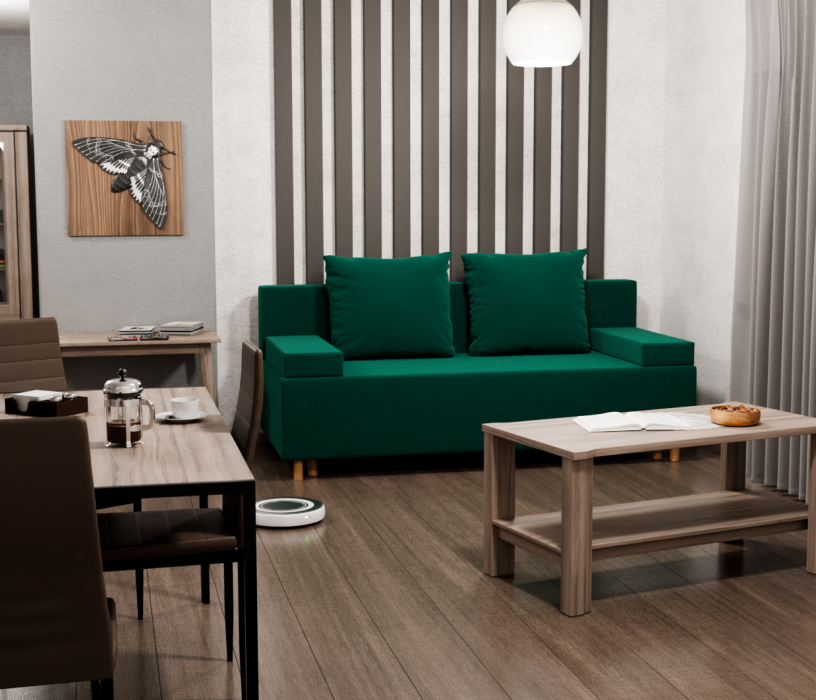 Диван-кровать имеет универсальный угол, что позволяет установить его в любой комнате, даже если она небольшая. Обивка выполнена из высококачественного велюра, который не только выглядит стильно, но и легко чистится.