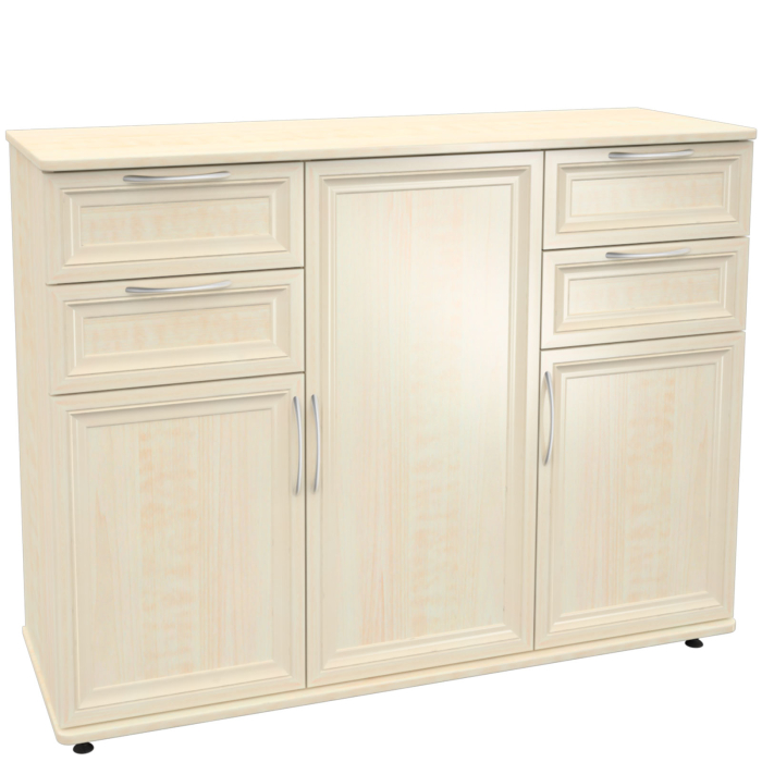 Комод 3 отличается многофункциональностью и большими размерами.оснащён выдвижными ящиками и дверками,скрывающими полки.Ножки из пластика,корпус ЛДСП,фасады рамочные МДФ.