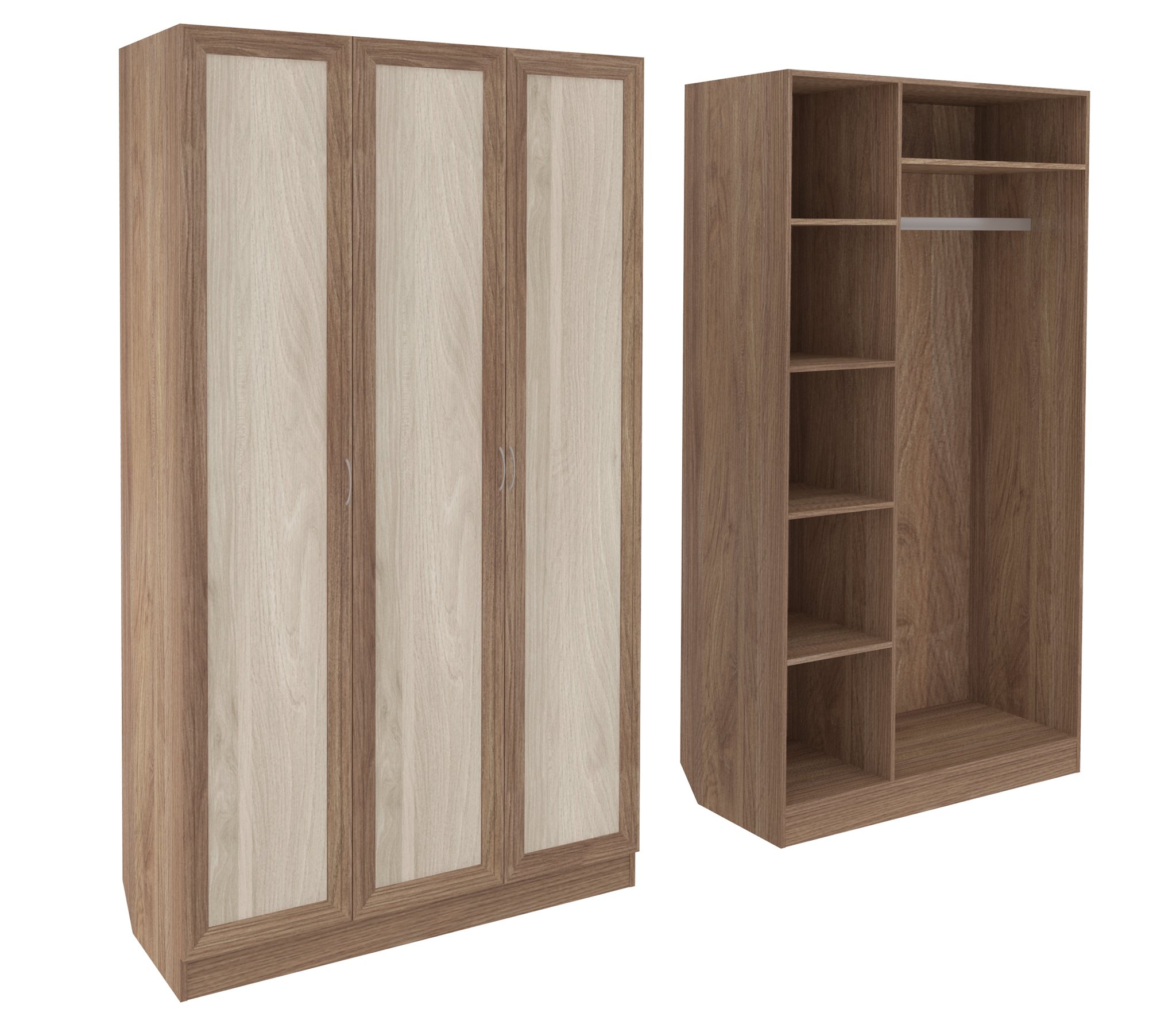 Корпус шкафа выполнен из Ламинированной ДСП высокого качества с насыщенным цветом. Фасады выполнены из материала МДФ.Ширина шкафа 120 см., большая и функциональная трёхстворчатая модель. В левой секции ниши для сложенных вещей. Справа штанга для одежды.