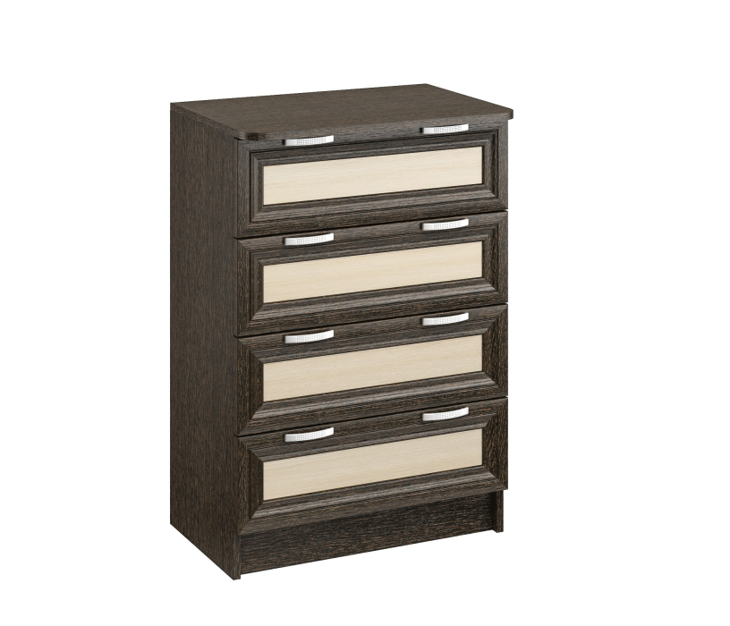 Комод ВС 600благодаря не большой ширине 62 см,удачно разместится даже в маленьком помещении.Тем не менее,4 выдвижных ящика,позволяют разместить множество вещей.Корпус ЛДСП,фасады рамочные МДФ.