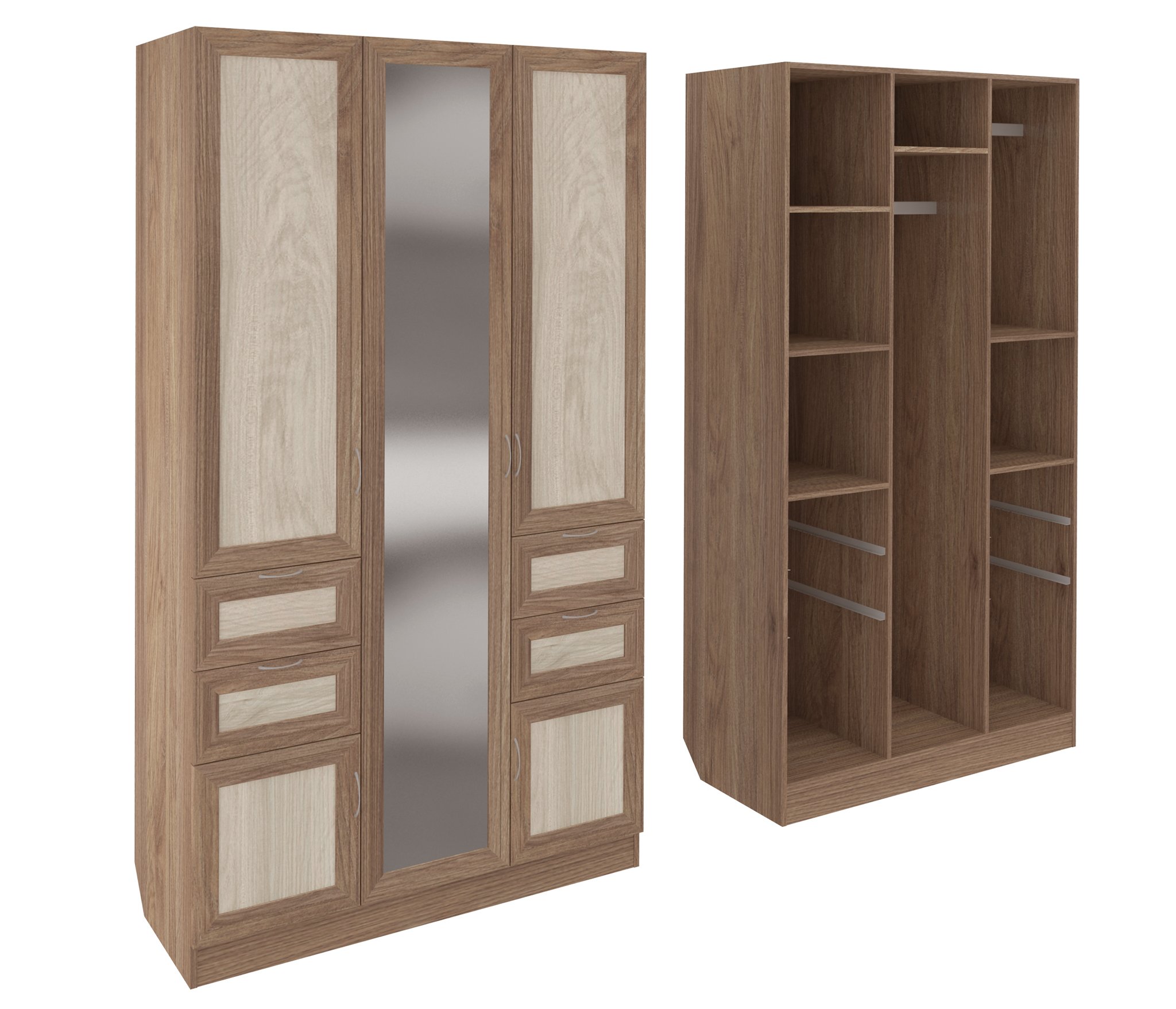 Корпус шкафа выполнен из Ламинированной ДСП высокого качества с насыщенным цветом. Фасады выполнены из материала МДФ.Большая и функциональная модель шириною 120 см., со множеством отделений закрытыми пятью распашными дверками. Вверху слева за дверью четыре ниши. Справа отделение со штангой и ниша внизу. Слева и Справа симметрично друг другу расположены по два выкатных ящика, и по две ниши с небольшими распашными дверцами. За центральной дверью большая, вертикальная секция со штангой для вешалок.В данной моделе установлено зеркало, которое вмонтировано на производстве в рамку фасада двери шкафа