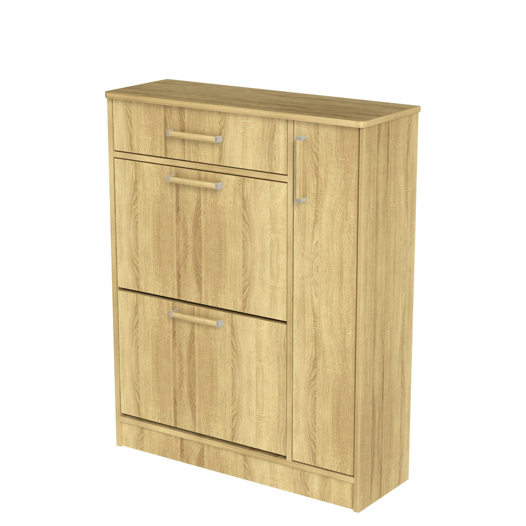 Обувница с двумя откидными нишами под обувь, распашной дверью со съемными полками и выдвижным ящиком. Тумба идеально встанет в Вашей прихожей и не займет много места.Корпус и фасады из качественного ЛДС.Производитель оставляет за собой право менять фурнитуру.