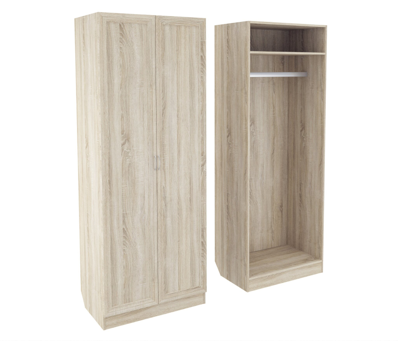 Корпус шкафа ШК-2 выполнен из Ламинированной ДСП высокого качества с насыщенным цветом. Фасады выполнены из материала МДФ.Шириною 80 см., это классический шкаф для верхней одежды, несет в себе следующие элементы. За распашными дверьми большая штанга, над ней ниша.