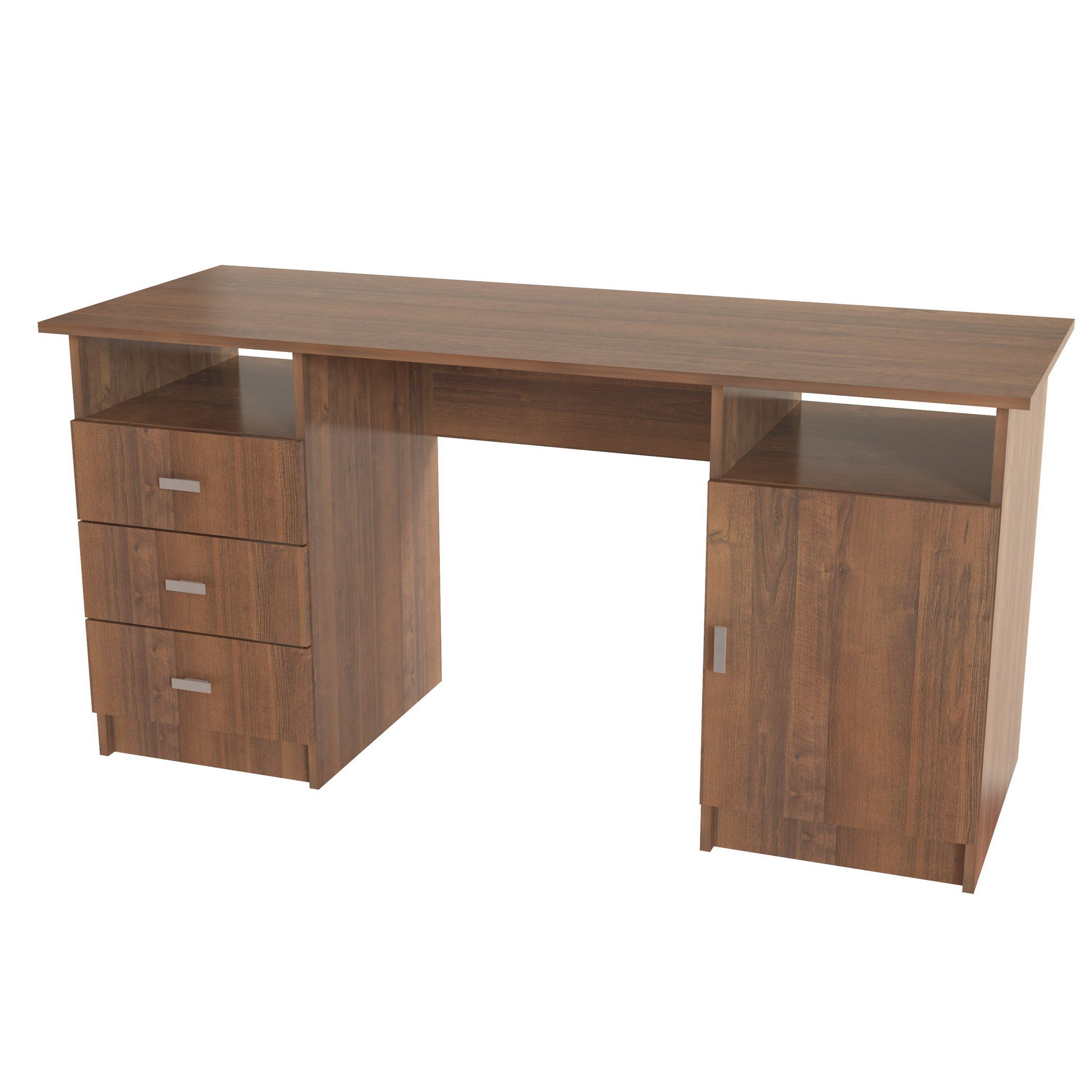 Стол СТ-8 изготовлен из ЛДСП.Оснащён 2-мя тумбами по бокам,одна тумба с дверью,за дверцей полка съёмная),другая оснащена выдвижными ящиками.Ширина 148,4 см,Выс 75 см,глуб 57 см.Удобен в использовании как для кабинета,так и для школьников.