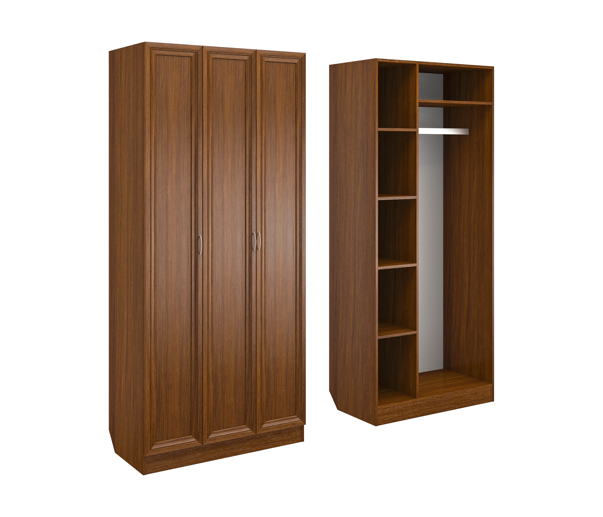 Корпус шкафа выполнен из Ламинированной ДСП высокого качества с насыщенным цветом. Фасады выполнены из материала МДФ.Шириною 110 см., большая и функциональная трёхстворчатая модель. В левой секции ниши для сложенных вещей. Справа штанга для одежды.