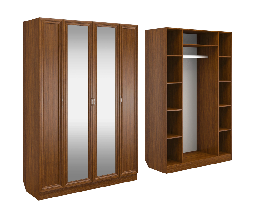 Корпус шкафа выполнен из Ламинированной ДСП высшего качества с насыщенным цветом. Фасады выполнены из материала МДФ.Шириною 140 см., модель с четырьмя створками. Слева и справа секции, по четыре полки в каждой. В центре узкая ниша, а под ней большая секция со штангой. Два зеркала в данной моделе так же включены в стоимость.В данной моделе используются зеркала, которые внедрены в рамки фасадов.