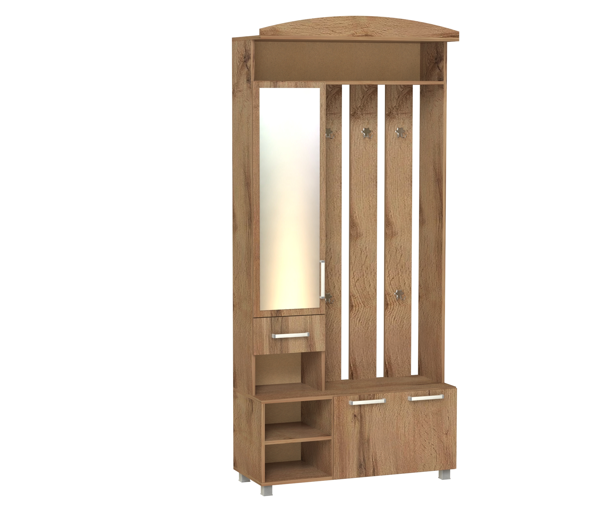 Корпус и фасады прихожей выполнен из Ламинированной ДСП высшего качества с насыщенным цветом. Шириною 95 см., данная прихожая похожа на седьмую модель, только без шкафа, разработана специально для тех кому он не нужен. Имеется узкое зеркало над ящиком, а снизу секция за откидной дверцей. Так же есть 5 двойных крючков на вешалке, как и на других моделях. Модель идеально подходит как для не больших помещений.