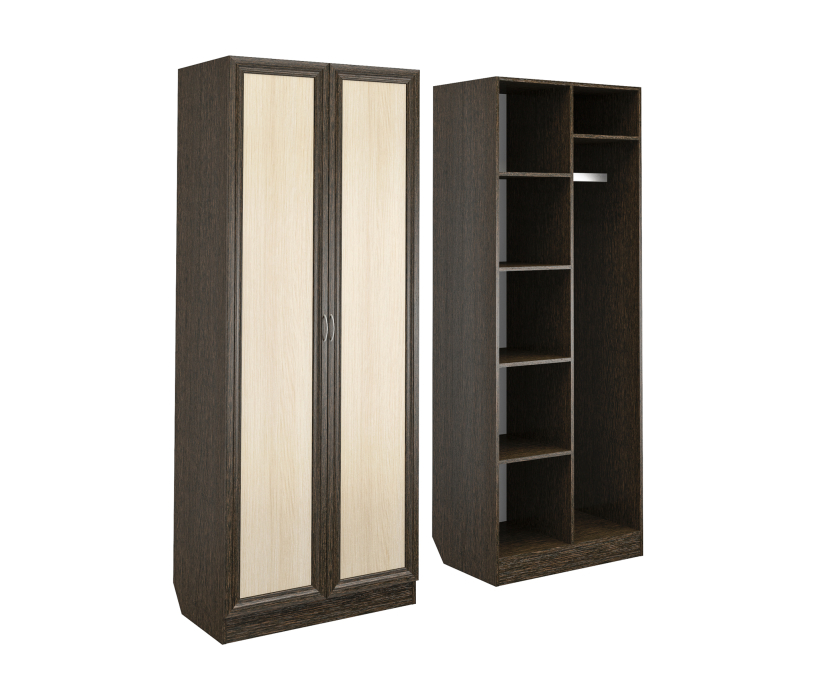 Корпус шкафа выполнен из Ламинированной ДСП высокого качества с насыщенным цветом. Фасады выполнены из материала МДФ.Шириною 80 см., это классический шкаф для верхней одежды, несет в себе следующие элементы. За распашными дверьми с одной стороны отделение с четырьмя полками, с другой штанга для одежды и узкая ниша над ней.