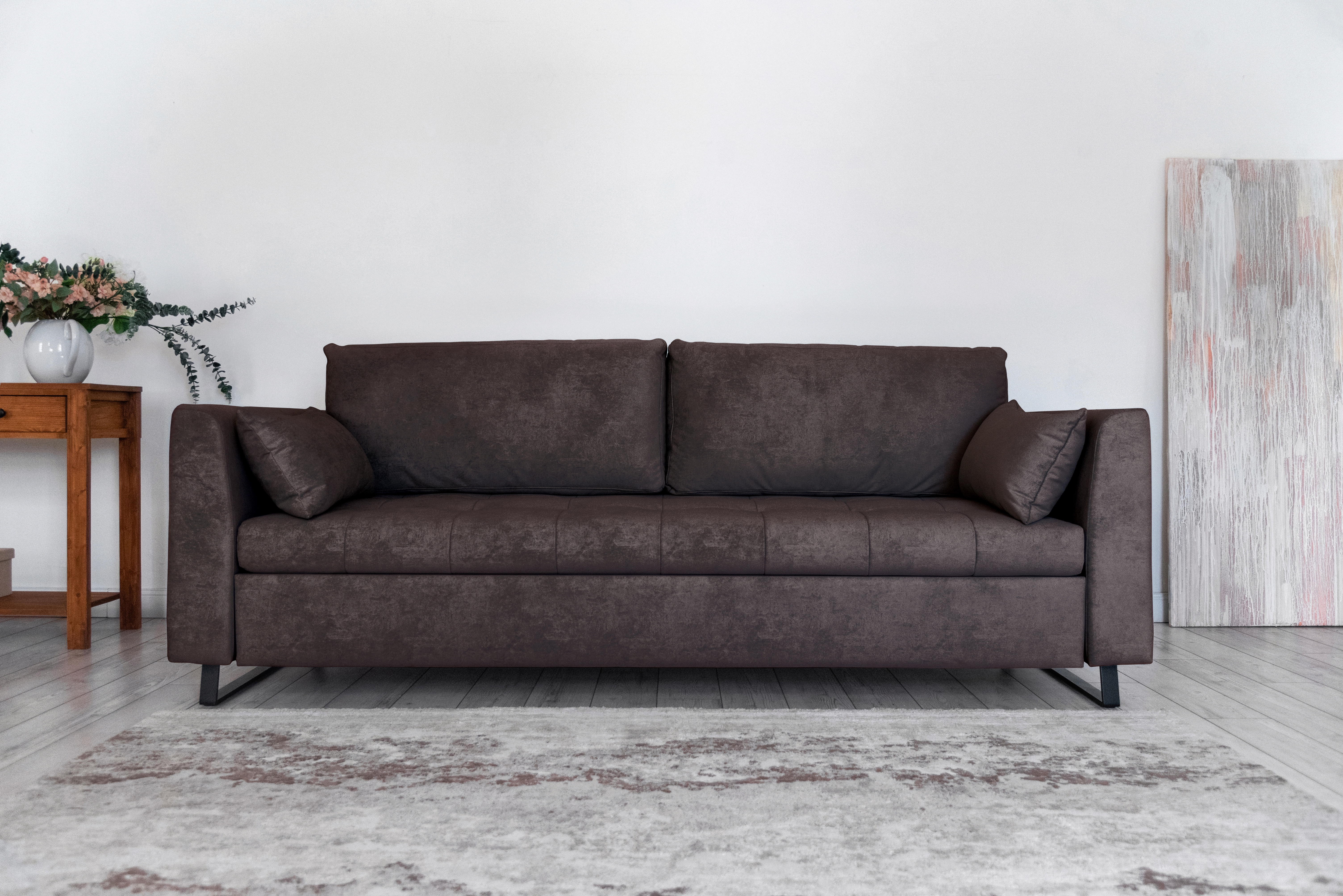 Механизм трансформации — шагающий (пантограф). Что позволяет использовать этот диван вместе с высокими коврами, и значительно упрощает раскладывание.