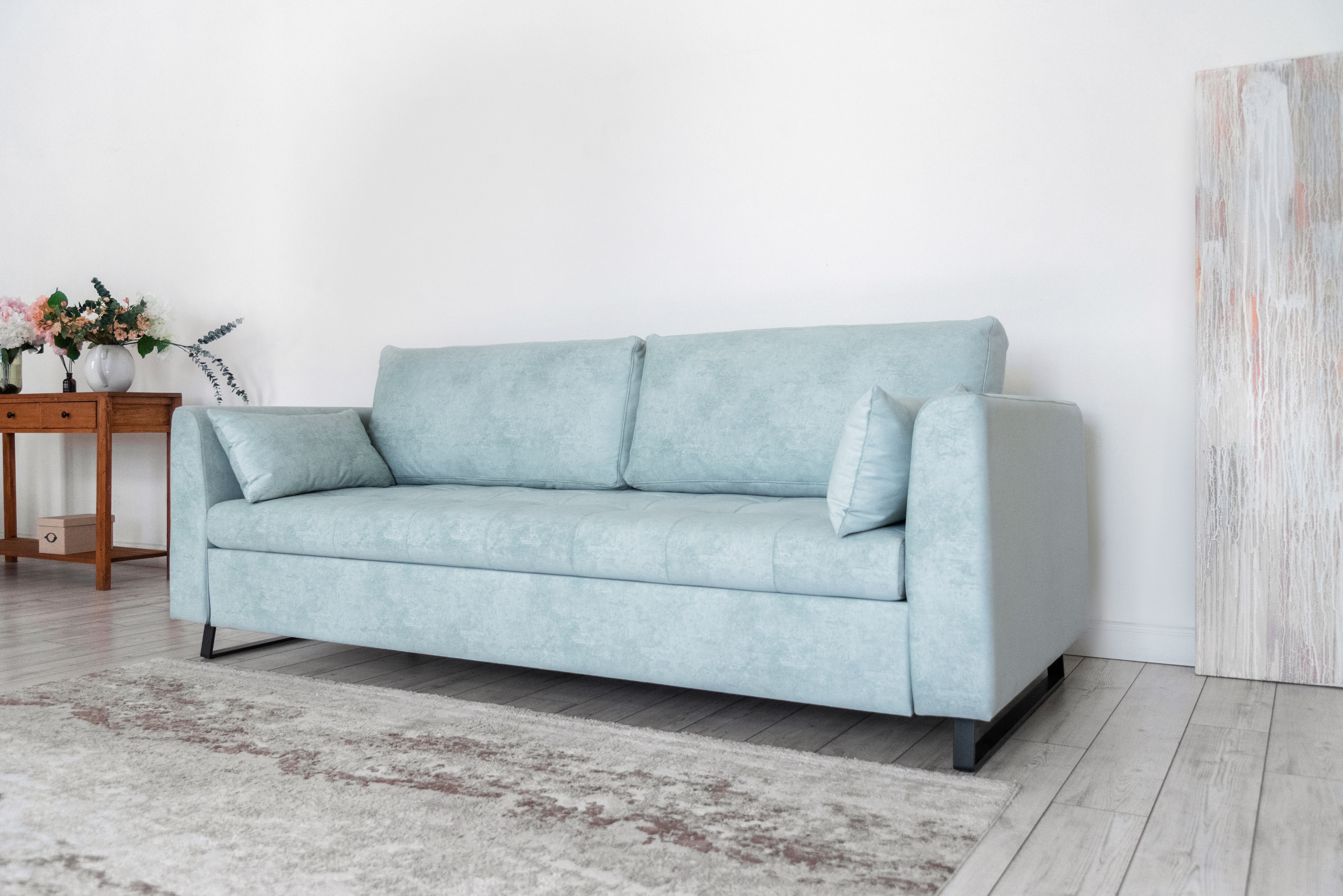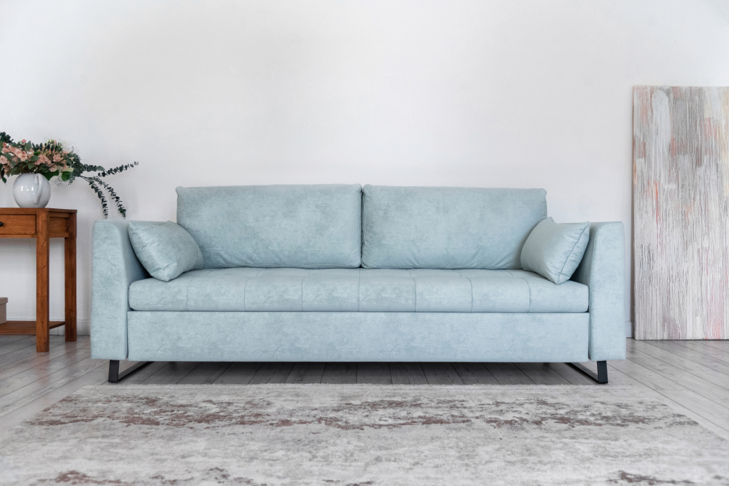 Механизм трансформации — шагающий (пантограф). Что позволяет использовать этот диван вместе с высокими коврами, и значительно упрощает раскладывание.