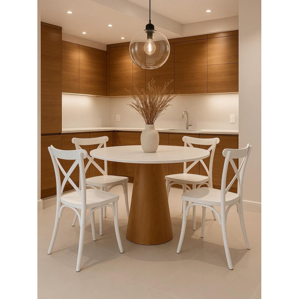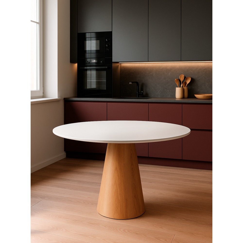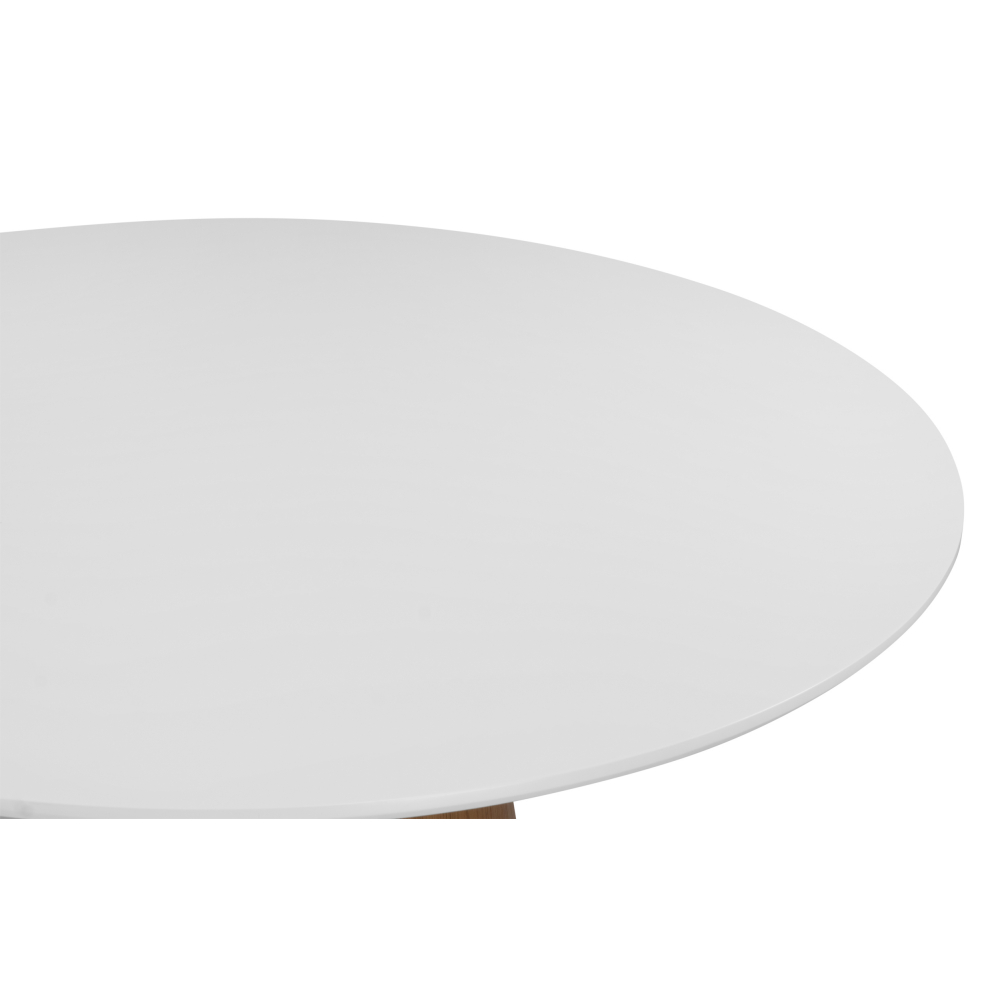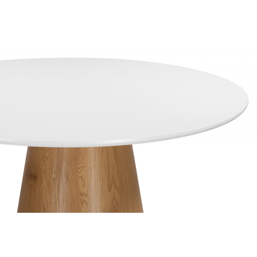 Стол Huge обеденный, с круглой столешницей белого цвета, выполнен из МДФ столешницы и ножки. Поверхность матовая. Комфортное размещение до 7 человек.