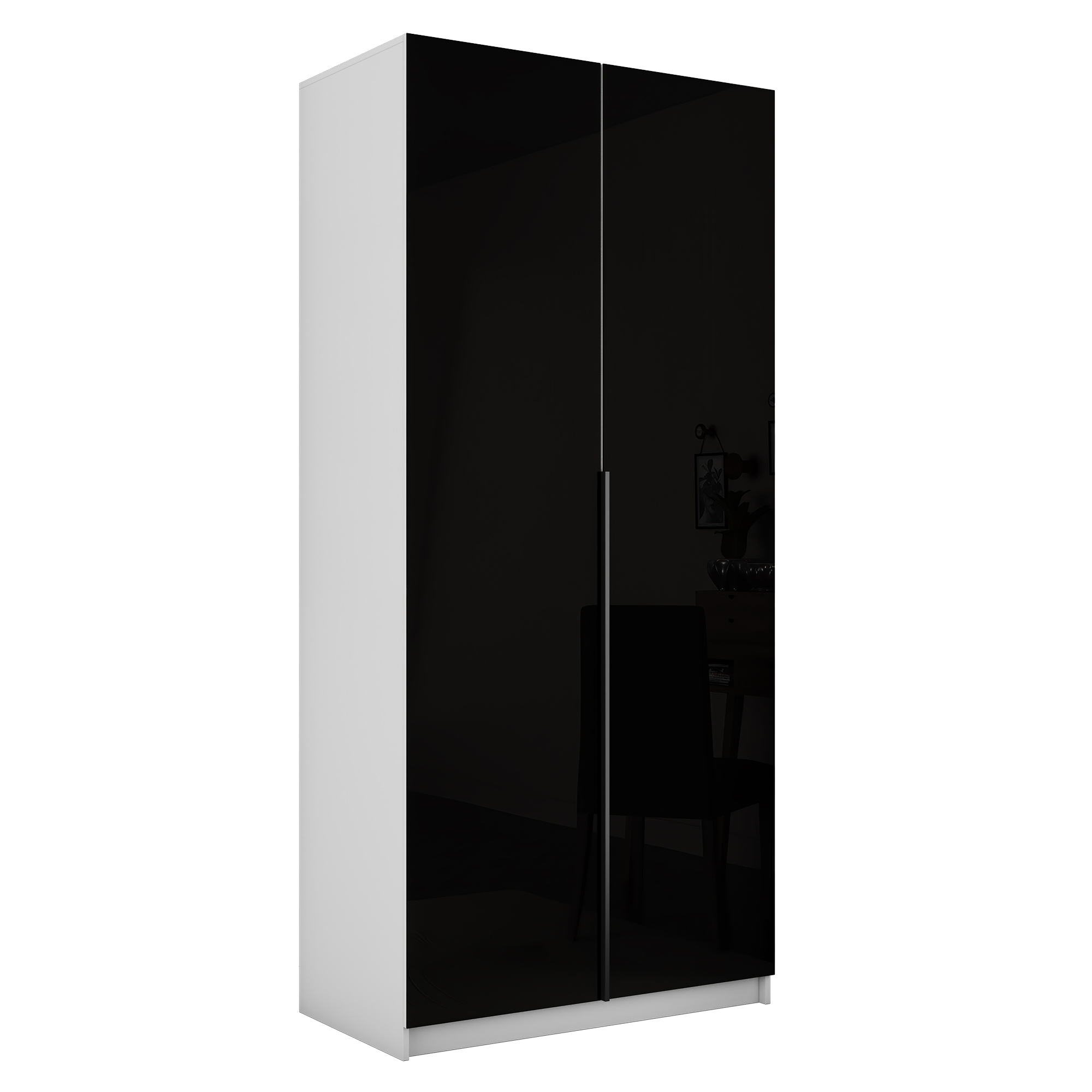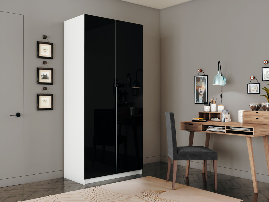 Шкаф распашной Е1 Локер 101x52.5x220 см, с черным стеклом , полками и модулем (Белый снег) Код I0000426791