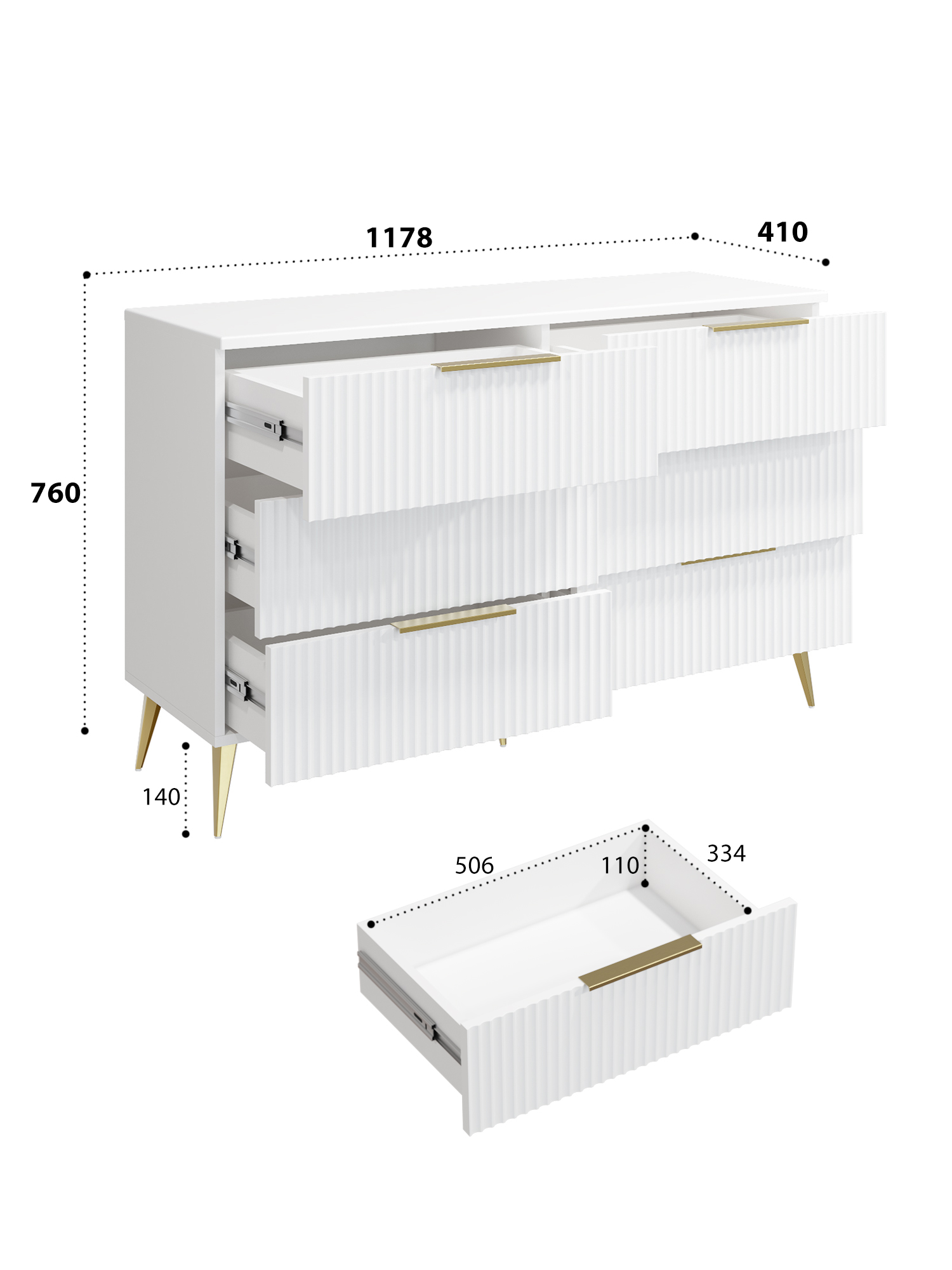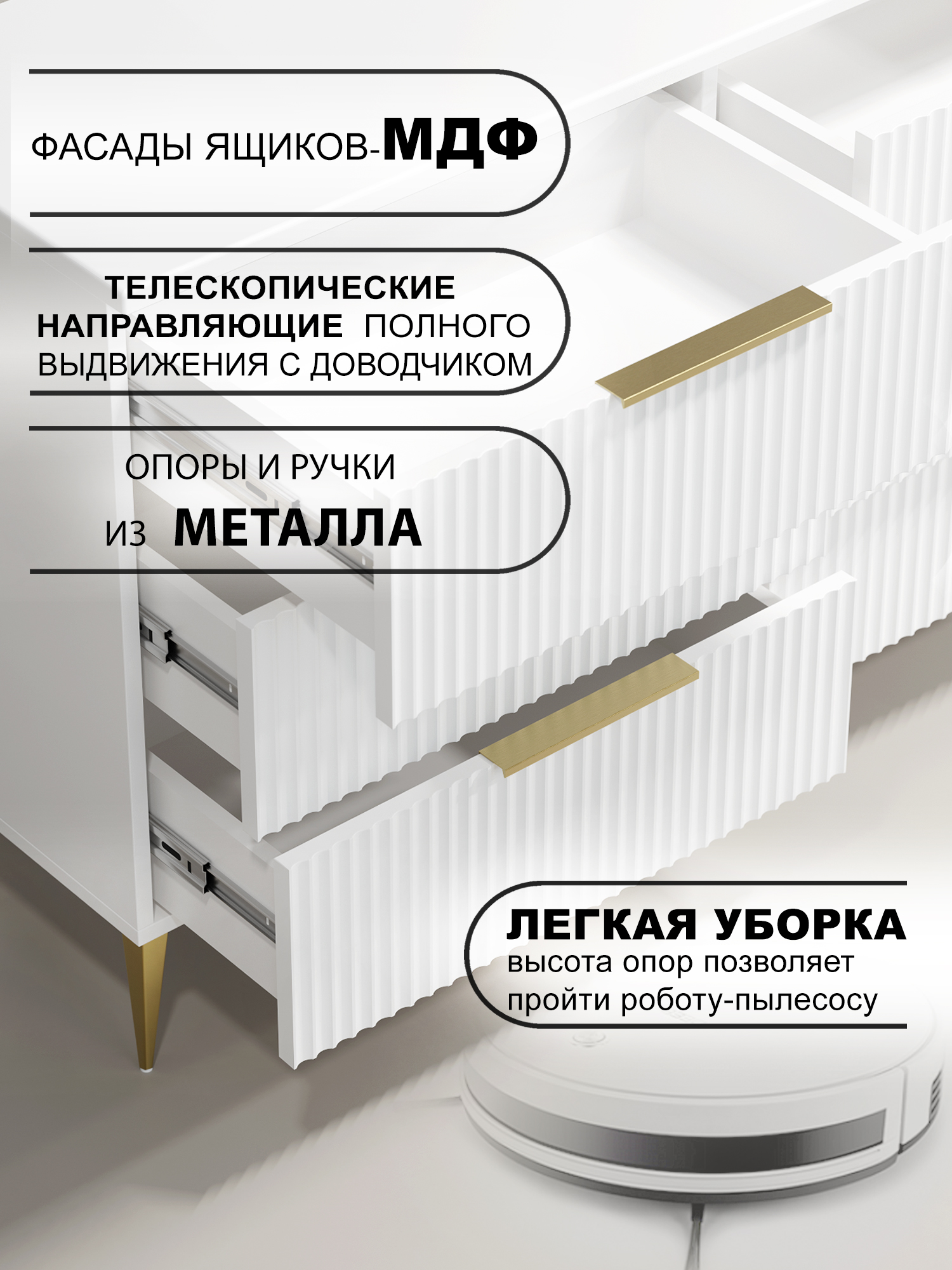 Шесть выдвижных ящиков на телескопических направляющих
