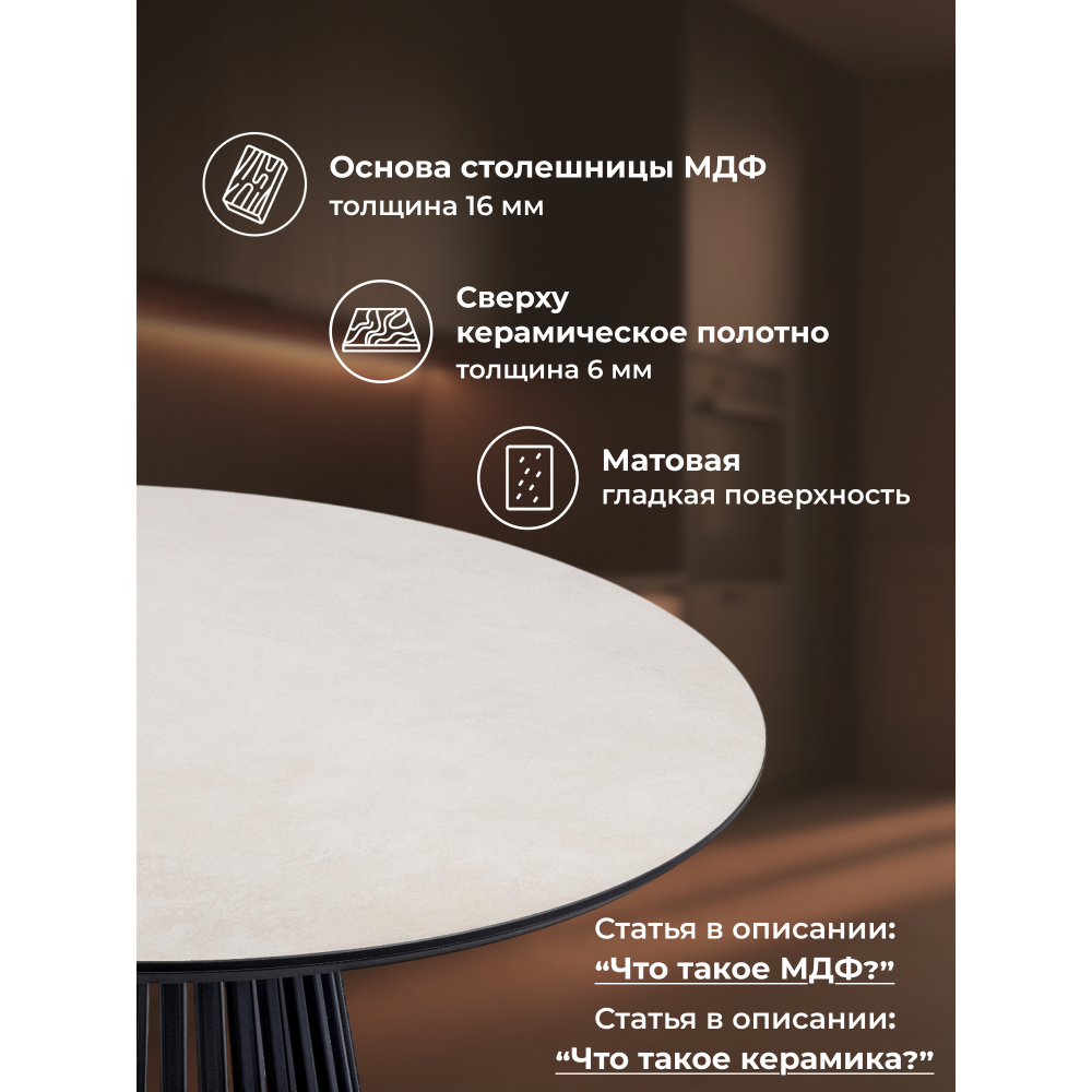 Керамический стол Нэнси — это действительно крутой выбор для вашего интерьера! Его стильный круглый дизайн не только привлекает внимание, но и создает уютную атмосферу для общения с друзьями и семьей. Керамическая поверхность обеспечивает долговечность и легкость в уходе, а компактные размеры идеально подходят для небольших пространств. Этот стол станет не только функциональным элементом, но и ярким акцентом в вашем доме! Основа столешницы из МДФ - 16мм, сверху керамическое полотно - 6мм. Порошковое окрашивание - дополнительная защита от царапин. Массивные ножки толщиной 3мм. Устойчивая и надёжная конструкция