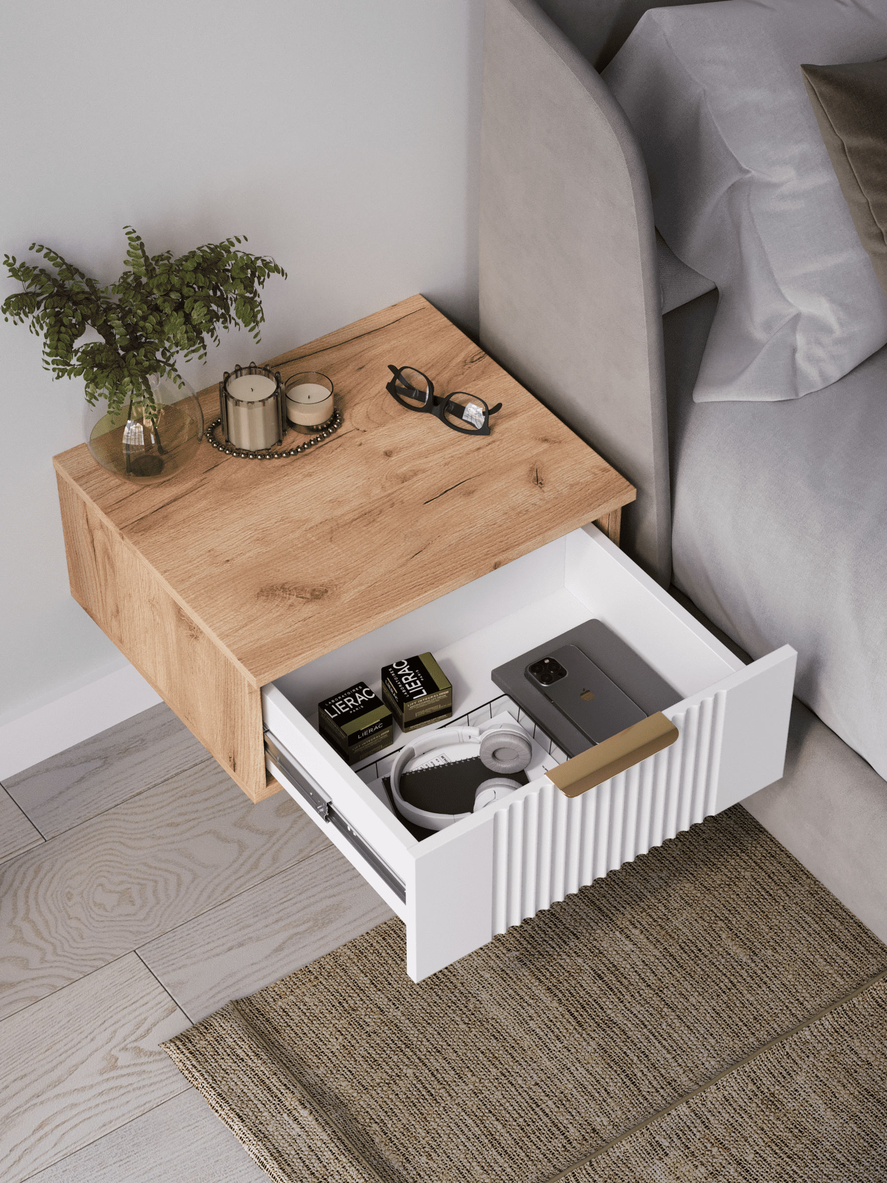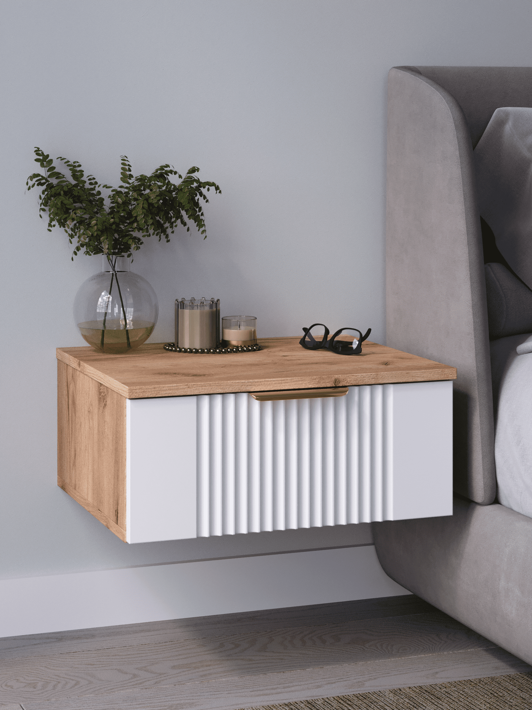 Подвесная прикроватная тумба с ящиком, соединяет в себе комфорт, функциональность и эстетику. Сегодня в тренде – стильные подвесные тумбы. Наша тумба подвесная российского производства выглядят легко и современно, идеально впишется в лофт, скандинавский, современный, минимализм и прочие популярные стили интерьеров. Ее минималистичный дизайн, невесомая конструкция и поразительная вместительность - придадут легкость и простор всему вашему интерьеру. Консоль подвесная размером 50х22х42 (ДхВхГ) см, сэкономит пространство и организует грамотное хранение вещей. Шкафчик навесной изготовлен из материалов высокого качества. За высокопрочность и долговечность отвечает корпус, выполненный из ЛДСП, подходит для активного использования. За эстетику и лаконичность дизайна отвечает фасад из МДФ созданный путем сложной фрезеровки в виде стильного 3D рисунка. Наша тумба прикроватная подвесная оснащена системой открывания push to open, которая подчеркивает монолитный образ. За удобство и комфорт открывания отвечают шариковые направляющие (без доводчиков). Ящик с такой системой открывания будет ходить практически бесшумно и выдвигаться полностью, даже при повышенной нагрузке (до 8 кг). Сборка этой узкой тумбы не требует особых навыков и не отнимет много времени. В комплекте для сборки настенного комода вы найдете все необходимые комплектующие и фурнитуру, что позволит вам легко и быстро собрать ее самостоятельно. Современная мебель должна не только брать на себя пару задач по организации пространства, но и гармонично смотреться. С этой задачей в интерьере справится шкаф с ящиком, который можно использовать в качестве прикроватной тумбы для хранения необходимых предметов рядом с кроватью в спальне. Тумбочка также может стать отличным туалетным столиком, где можно поместить любимую косметику и аксессуары для ухода за собой. Тумба прикроватная Ингрия-1 отлично прослужит как тумба в прихожую или в коридор, внутри нее можно хранить ключи или другие мелкие предметы. Благодаря возможности навесить тумбу на стену на нужной высоте, появится возможность оптимально использовать пространство комнаты. Это особенно актуально для небольших помещений, где каждый квадратный метр имеет значение. Особенно полезной полка с выдвижным ящиком будет в офисных помещениях, так как эта офисная тумба придаст лаконичности и удобства любому помещению. Тумба навесная Ингрия найдет применение и в салонах красоты и в детских комнатах. Почувствуйте себя дизайнером создайте уют с помощью нашей многофункциональной ниши для хранения.