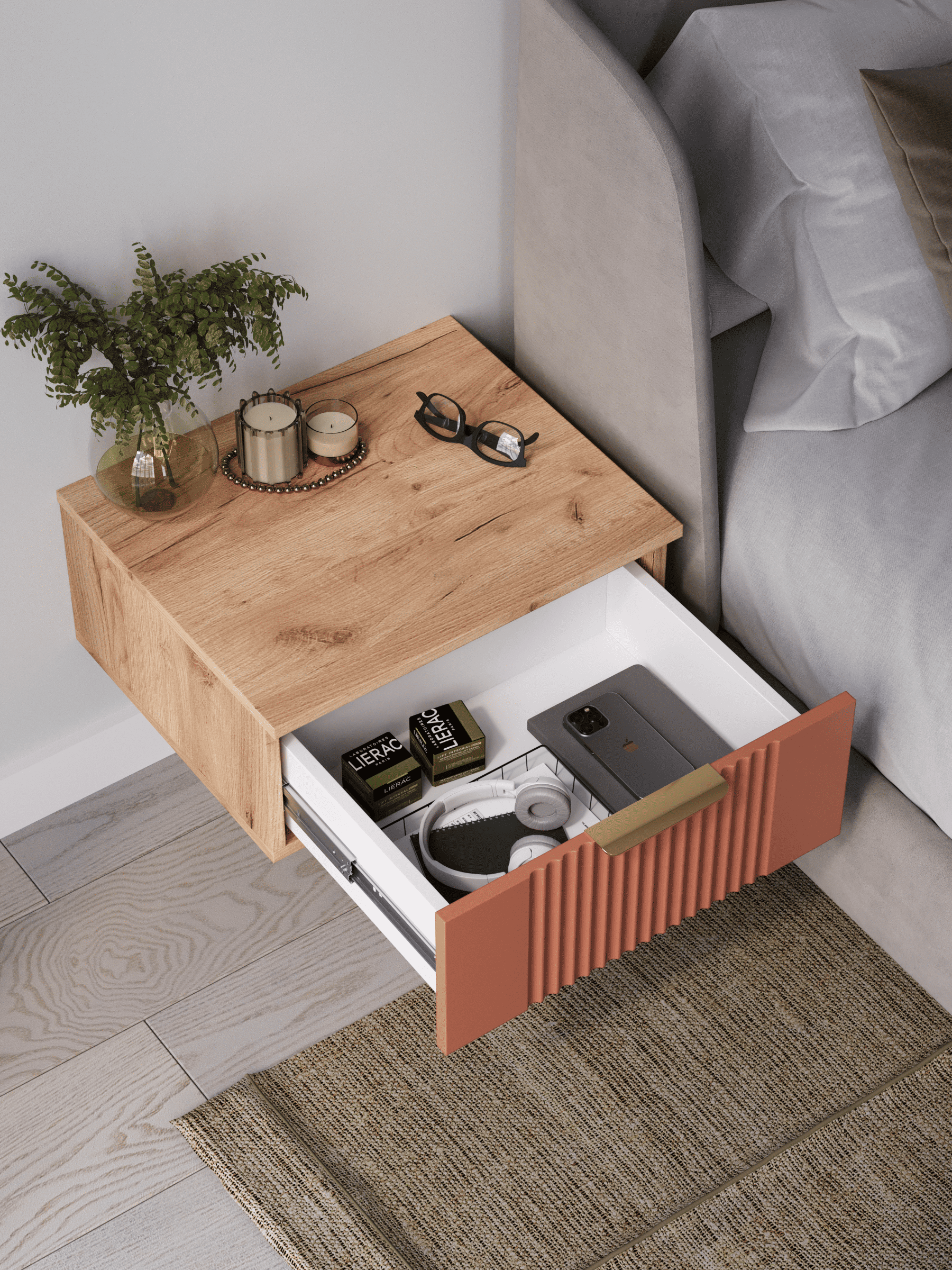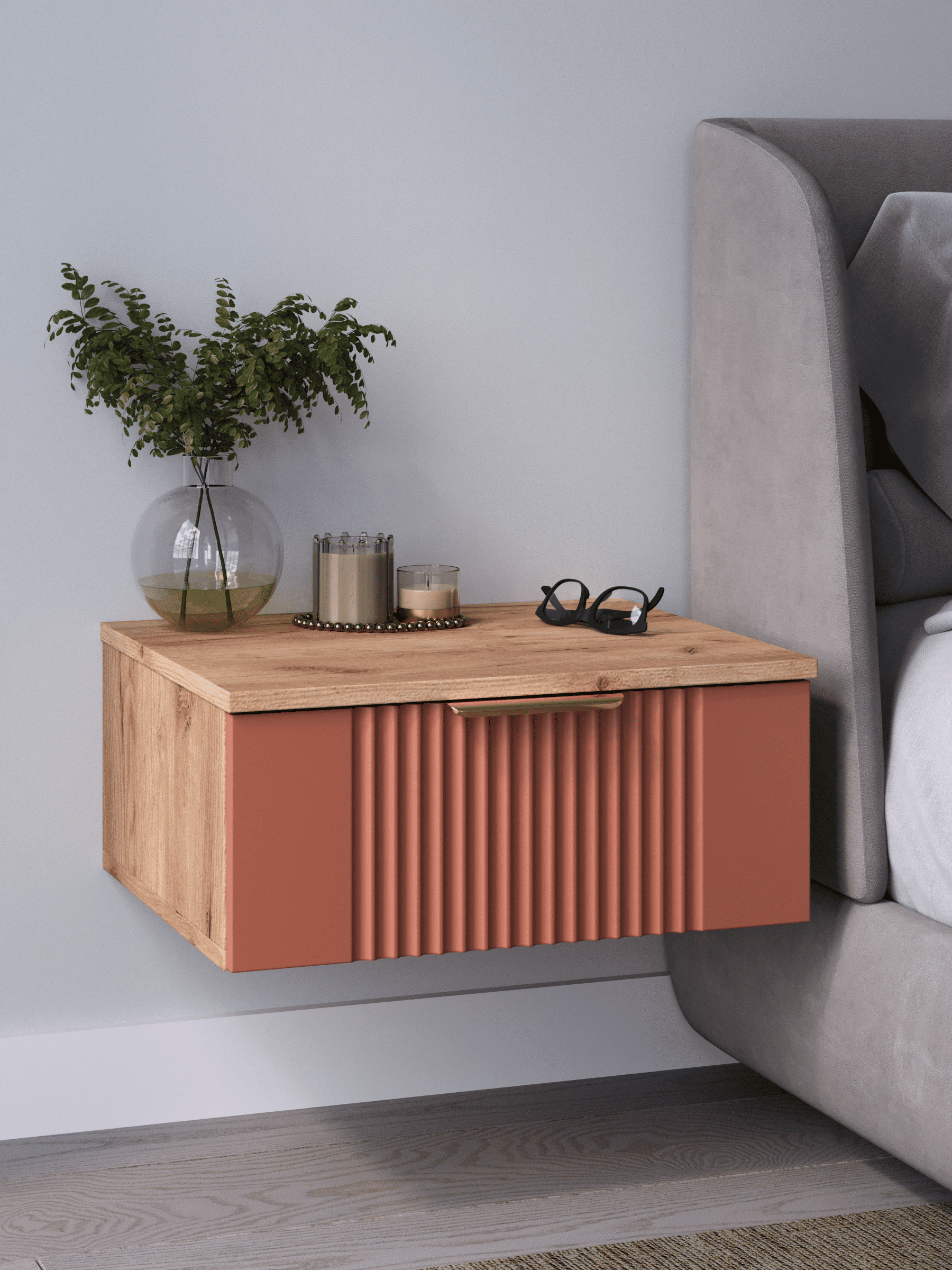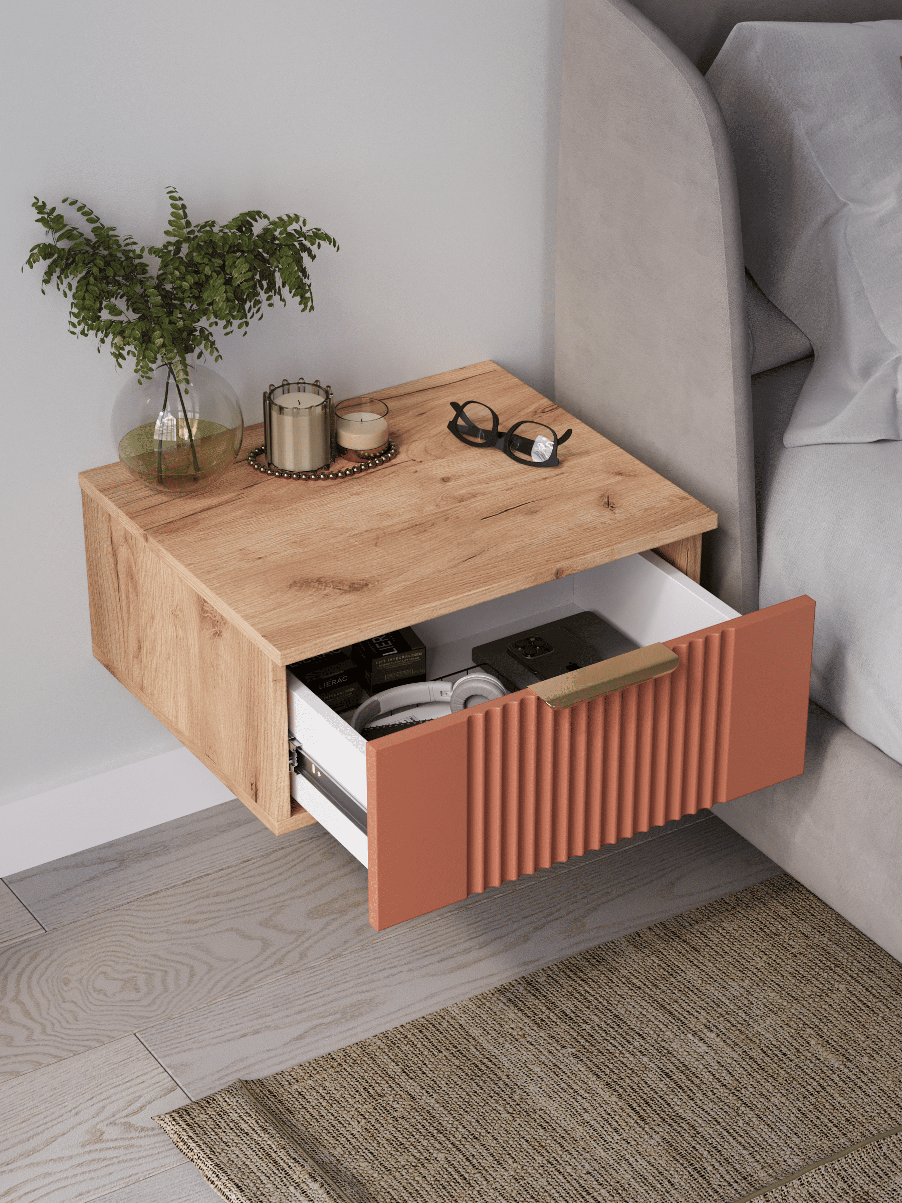 Подвесная прикроватная тумба с ящиком, соединяет в себе комфорт, функциональность и эстетику. Сегодня в тренде – стильные подвесные тумбы. Наша тумба подвесная российского производства выглядят легко и современно, идеально впишется в лофт, скандинавский, современный, минимализм и прочие популярные стили интерьеров. Ее минималистичный дизайн, невесомая конструкция и поразительная вместительность - придадут легкость и простор всему вашему интерьеру. Консоль подвесная размером 50х22х42 (ДхВхГ) см, сэкономит пространство и организует грамотное хранение вещей. Шкафчик навесной изготовлен из материалов высокого качества. За высокопрочность и долговечность отвечает корпус, выполненный из ЛДСП, подходит для активного использования. За эстетику и лаконичность дизайна отвечает фасад из МДФ созданный путем сложной фрезеровки в виде стильного 3D рисунка. Наша тумба прикроватная подвесная оснащена системой открывания push to open, которая подчеркивает монолитный образ. За удобство и комфорт открывания отвечают шариковые направляющие (без доводчиков). Ящик с такой системой открывания будет ходить практически бесшумно и выдвигаться полностью, даже при повышенной нагрузке (до 8 кг). Сборка этой узкой тумбы не требует особых навыков и не отнимет много времени. В комплекте для сборки настенного комода вы найдете все необходимые комплектующие и фурнитуру, что позволит вам легко и быстро собрать ее самостоятельно. Современная мебель должна не только брать на себя пару задач по организации пространства, но и гармонично смотреться. С этой задачей в интерьере справится шкаф с ящиком, который можно использовать в качестве прикроватной тумбы для хранения необходимых предметов рядом с кроватью в спальне. Тумбочка также может стать отличным туалетным столиком, где можно поместить любимую косметику и аксессуары для ухода за собой. Тумба прикроватная Ингрия-1 отлично прослужит как тумба в прихожую или в коридор, внутри нее можно хранить ключи или другие мелкие предметы. Благодаря возможности навесить тумбу на стену на нужной высоте, появится возможность оптимально использовать пространство комнаты. Это особенно актуально для небольших помещений, где каждый квадратный метр имеет значение. Особенно полезной полка с выдвижным ящиком будет в офисных помещениях, так как эта офисная тумба придаст лаконичности и удобства любому помещению. Тумба навесная Ингрия найдет применение и в салонах красоты и в детских комнатах. Почувствуйте себя дизайнером создайте уют с помощью нашей многофункциональной ниши для хранения.