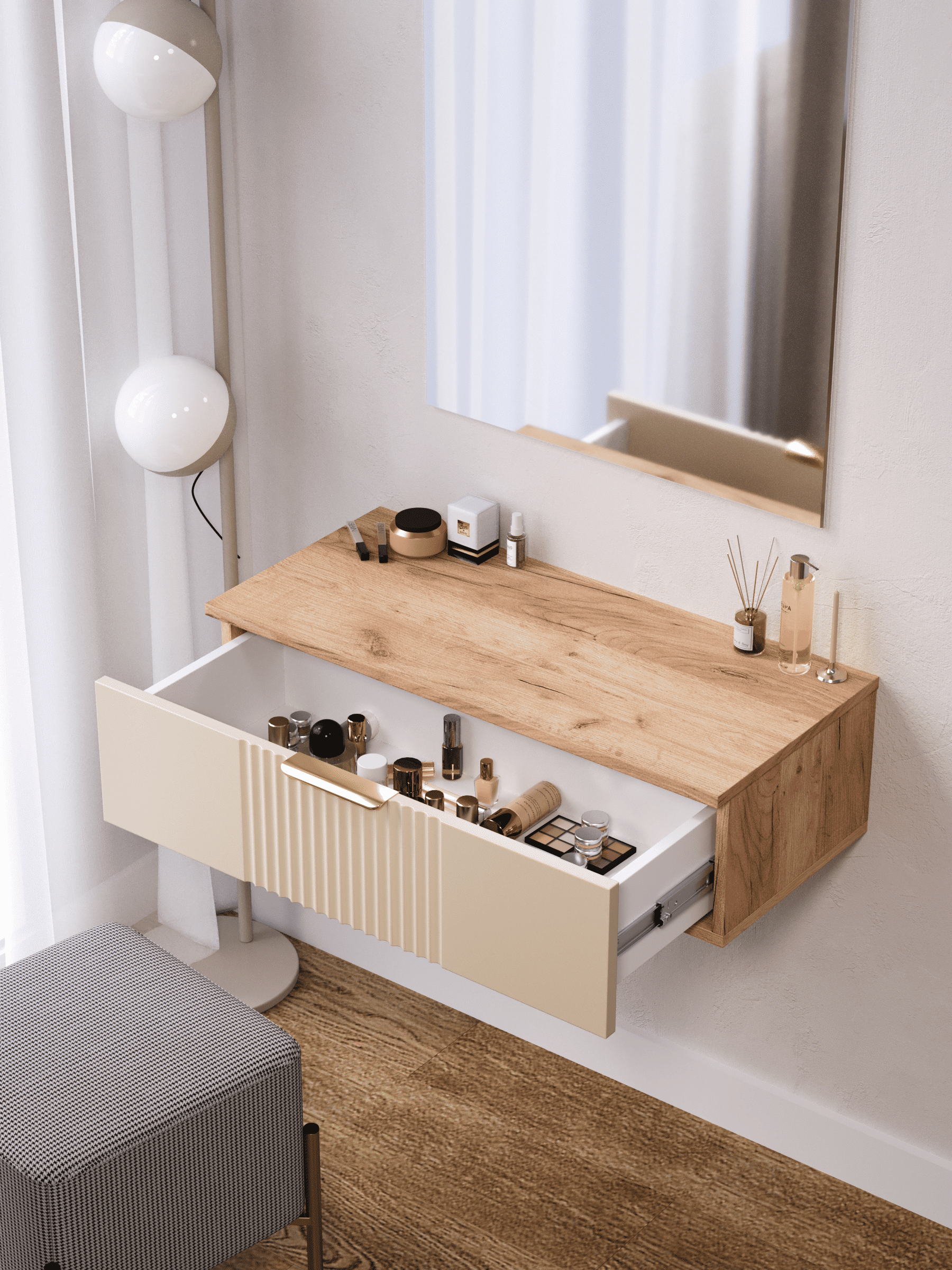 Стильный и практичный Туалетный столик Ингрия Luxe с ящиками, решит как минимум две ваших задачи, будет служить многофункциональной нишей для хранения вещей, и универсальной подставкой для различных предметов интерьера. Наша модель Ингрия Luxe российского производства выглядят легко и современно, идеально впишется в лофт, скандинавский, современный, минимализм и прочие популярные стили интерьеров. Его минималистичный дизайн придадут легкость и простор всему вашему интерьеру. Компактный туалентный столик сэкономит пространство и организует грамотное хранение вещей. Имеет выдвижной ящик. За удобство и комфорт открывания ящика отвечают шариковые направляющие (без доводчиков), с полным выдвижением и системой открывания Push-to-Open . Ящики с такой системой открывания будут ходить практически бесшумно, и выдвигаться полностью, даже при повышенной нагрузке. За высокопрочность и долговечность отвечает корпус, выполненный из ЛДСП, подходит для активного использования. За эстетику и лаконичность дизайна отвечает фасад из МДФ созданный путем сложной фрезеровки в виде 3D рисунка.