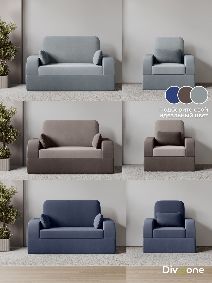 Диван и кресло в комплекте от бренда Div-one представляют собой идеальное решение для создания уютного и функционального пространства в вашем доме. Этот бескаркасный набор мебели выполнен из качественного пенополиуретана и покрыт мягким велюром, обеспечивая комфорт и долговечность.