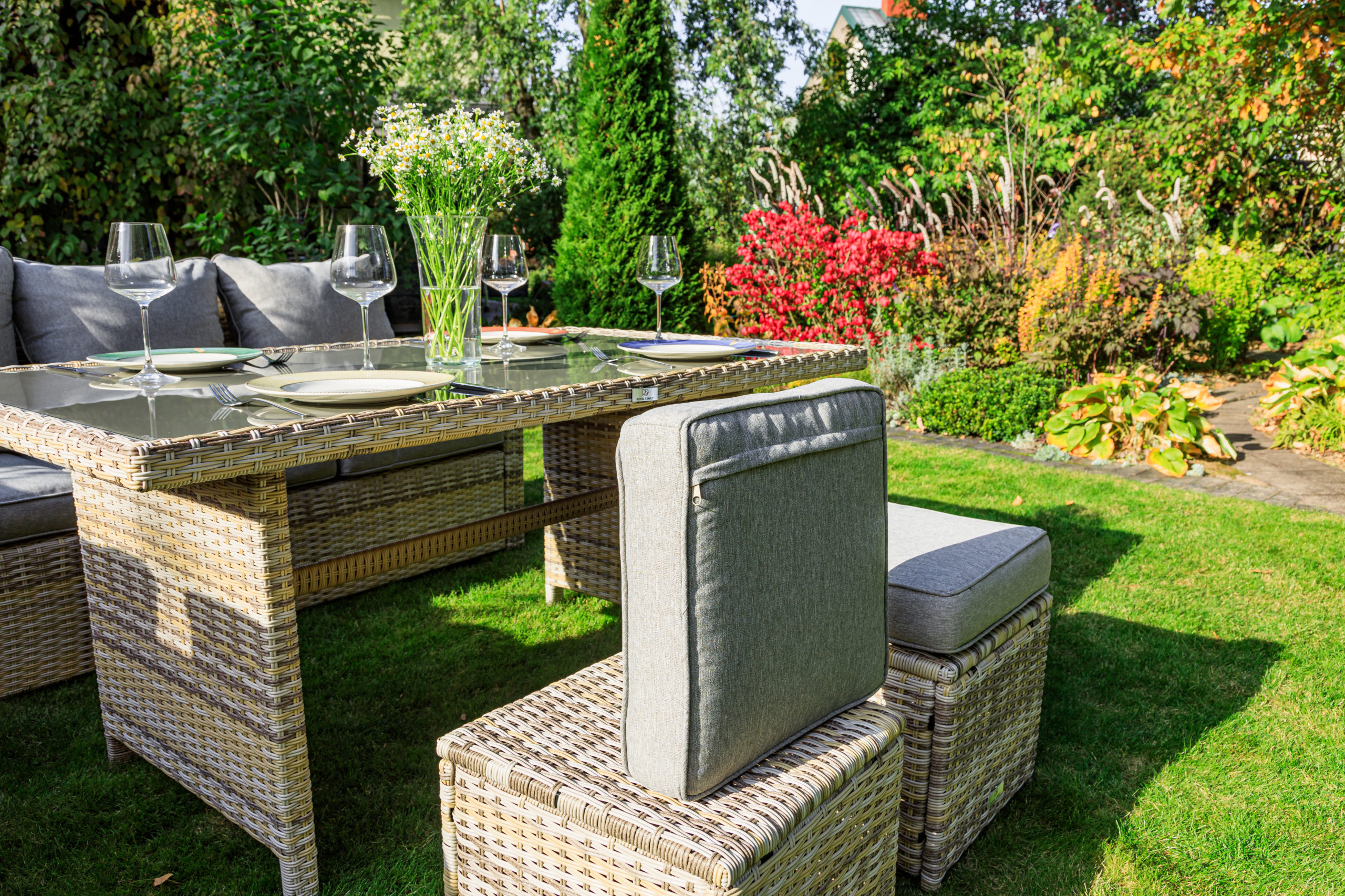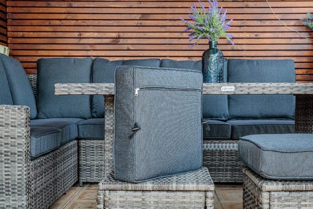 Премиальная мебель ручной работы в каждую семью! Угловой комплект садовой мебели из искусственного ротанга станет отличным решением для всех, кто отдает предпочтение летнему отдыху в тени приусадебного сада или на придомовой террасе. В набор входит все необходимое для организации полноценного уголка досуга даже для самой большой семьи. Комплект мебели ZORRO – лучший выбор для отдыха Вы состав набора садовой мебели входят: большой угловой диван, на котором без труда сможет разместиться 5-6 персон; два мягких пуфа; высокий обеденный стол со столешницей прямоугольной формы из закаленного стекла. Благодаря такой компоновке комплект подойдет не только для тихого семейного отдыха или вечерних совместных трапез, но и времяпровождения в кругу близких друзей. ZORRO – изысканность и практичность Набор уличной мебели изготовлен на основе прочного металлического каркаса с декоративной отделкой из плетеного ручным способом техноротанга. Благодаря натуральному серому оттенку он гармонично вписывается в любое окружение, не делая на себе лишних акцентов. Что касается эксплуатационных качеств садовой мебели ZORRO, то среди них стоит отметить: устойчивость к осадкам и солнечному свету; способность выдерживать высокие весовые нагрузки; стойкость к царапанию и прочему механическому воздействию; небольшой вес предметов для удобной переноски с места на место. Комплект дополнен мягкими подушками-сидениями с чехлами из водонепроницаемой ткани.