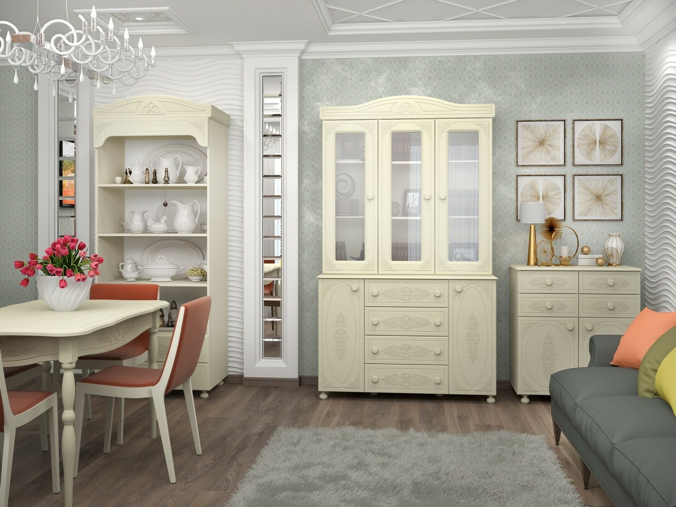 «Ассоль» - мягкий мерцающий глянец и эксклюзивный узор, повторяющийся на фасадах всех модулей идеален для создания нежного уютного интерьера спальни, гостиной, детской, прихожей.Стол идеально подходит для создания нарядной столовой. Размер столешницы 1200 мм * 800 мм.