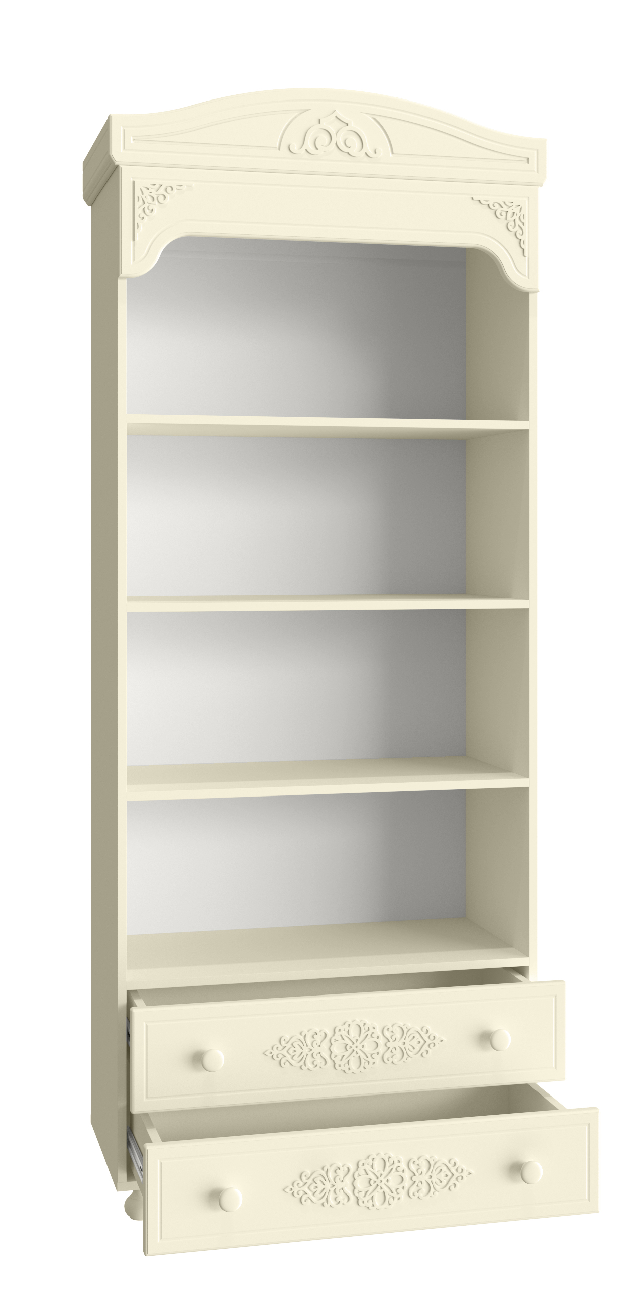 Стеллаж с открытыми полками и двумя выдвижными ящиками. Высота полок 323 мм. Высота верхней полки — 516 мм. Высота боковых стенок каждого ящика 130 мм, ширина ящика 708 мм, глубина 350 мм. Ящики установлены на телескопических направляющих полного выдвижения.