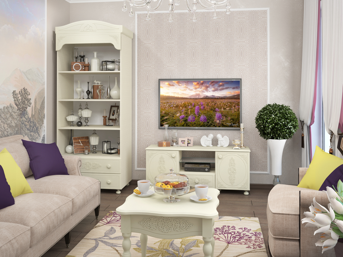«Ассоль» - мягкий мерцающий глянец и эксклюзивный узор, повторяющийся на фасадах всех модулей идеален для создания нежного уютного интерьера спальни, гостиной, детской, прихожей.