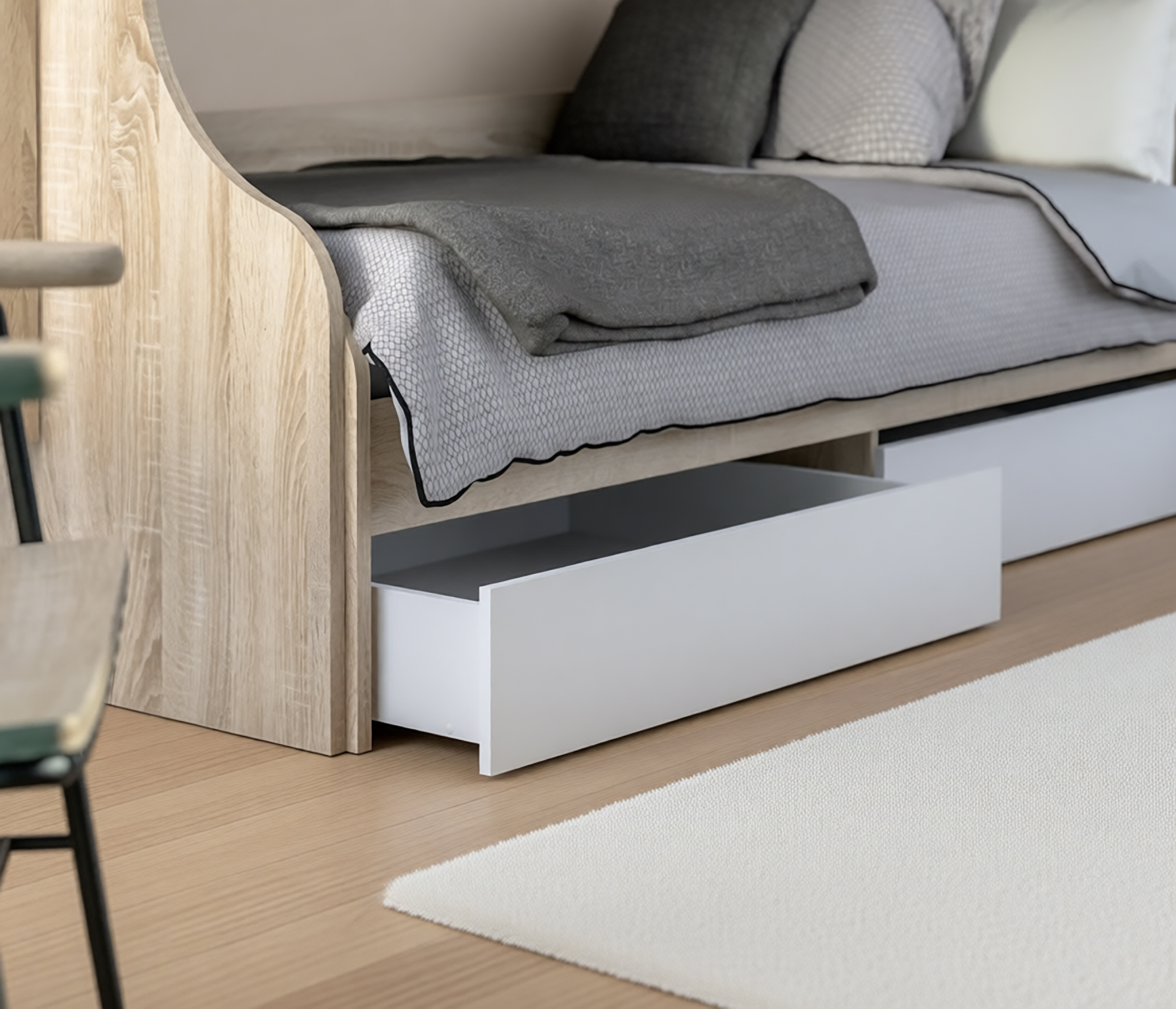 Кровать из детского гарнитура «Мамбо» – симпатичная и комфортабельная модель, воспользоваться которой могут даже взрослые члены семьи. Занимая не так уж и много места, она выделяется своей функциональной значимостью. Три в одном. Днем это вполне приличный диванчик, ночью полноценное спальное место шириной 95 см, к тому же, это и система хранения постельных принадлежностей, так как модель оборудована двумя объемными выдвигающимися ящиками. Кровать собрана из мебельных щитов повышенной прочности с износостойким поверхностным покрытием приятного пастельного оттенка «Дуб Сонома». Ящики и фасады к ним изготовлены из ДСП песочного цвета. Неброское сочетание цветов вносит в интерьер гармонию и умиротворение, что бывает нелишним, когда требуется успокоить разыгравшегося ребенка.