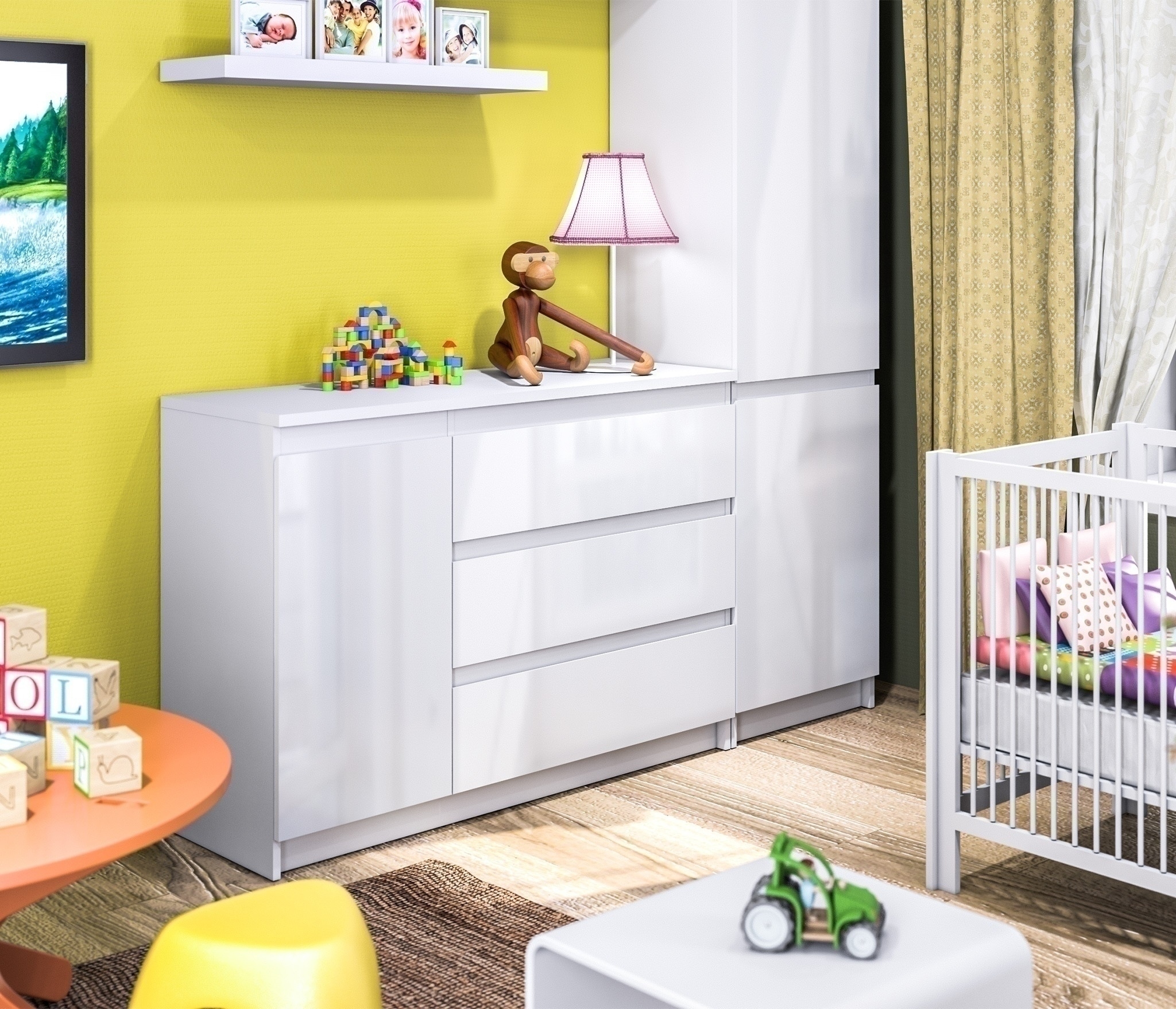 Размеры комода – ширина 120 см, высота 86 см и глубина 44 см. Под одной столешницей объединены три выдвижных ящиков и тумба. Тумба оснащена двумя довольно высокими полками. Комод Медея выполнен из прочного и влагоустойчивого материала. Все выдвижные механизмы прочные и имеют солидный ресурс. Комод выполнен в лаконичном дизайне, белое глянцевое покрытие фасадов позволяет смотреться этому предмету мебели стильно и не громоздко.