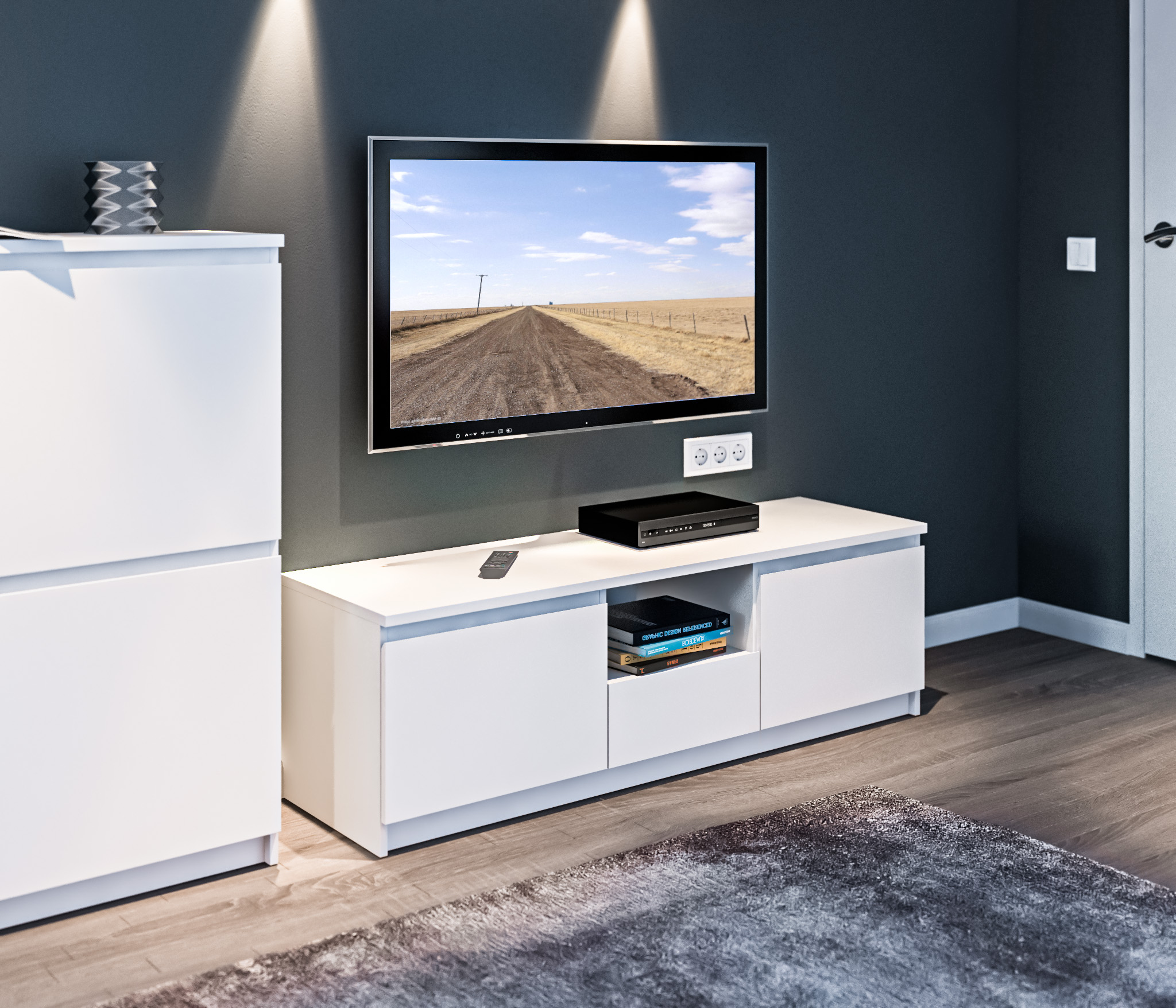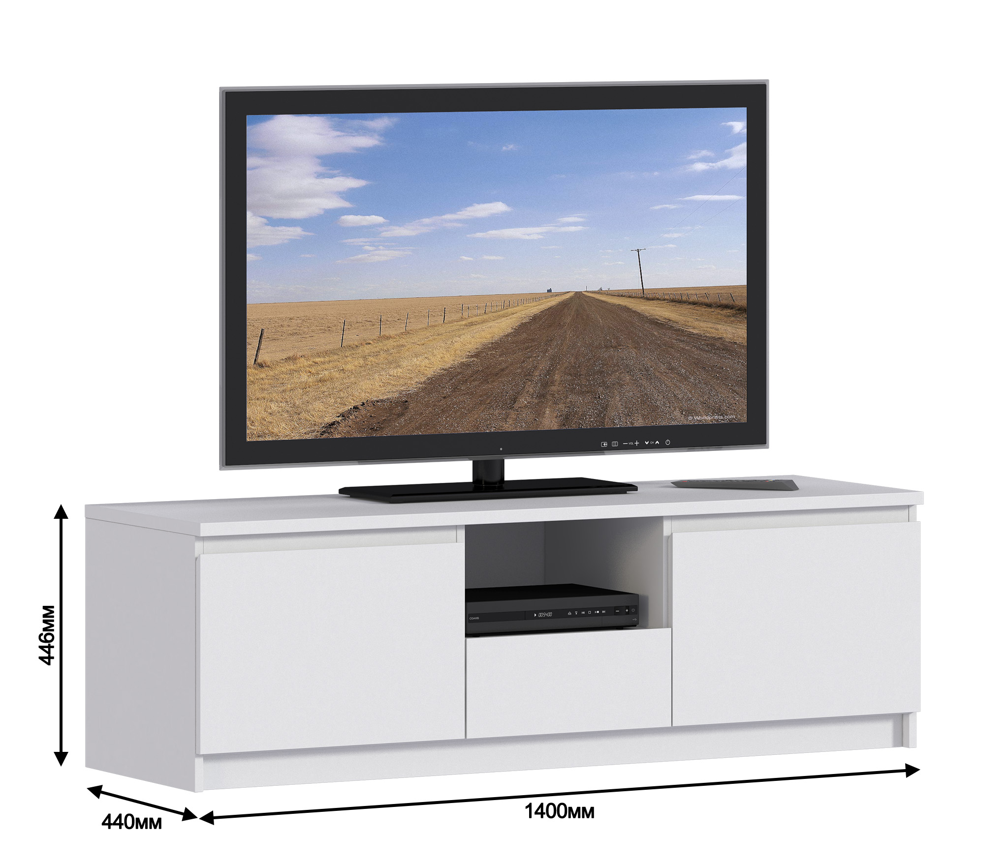 Габаритные размеры – ширина 140 см, высота 44 см и глубина 44 см. Вес тумбы 33,92 кг, что даёт возможность передвигать её по усмотрению. Визуально тумбу можно разделить на три отделения. В центре над выдвижным ящиком расположена открытая полка. По бокам два вместительных отделения за отдельными дверцами. Отличительной особенностью тумбы является отсутствие ручек, которые интегрированы в фасады. ¶Тумба выполнена в лаконичном дизайне из экологичного современного ЛДСП. Материал отделки устойчив к влаге и воздействию бытовых чистящих средств, что актуально для светлых поверхностей.