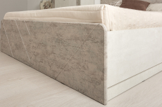 Фрезеровка на МДФ деталях и зеркалах подчеркивает форму металлических ручек, а декоративная прострочка на мягком изголовье и изножье кровати прострочкой повторяет общий мотив коллекции.