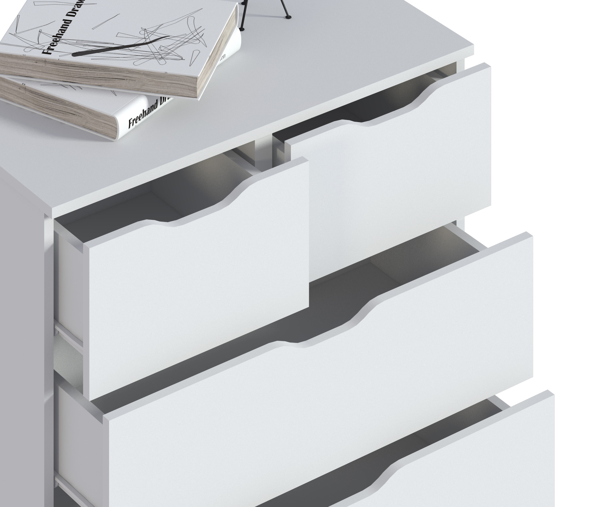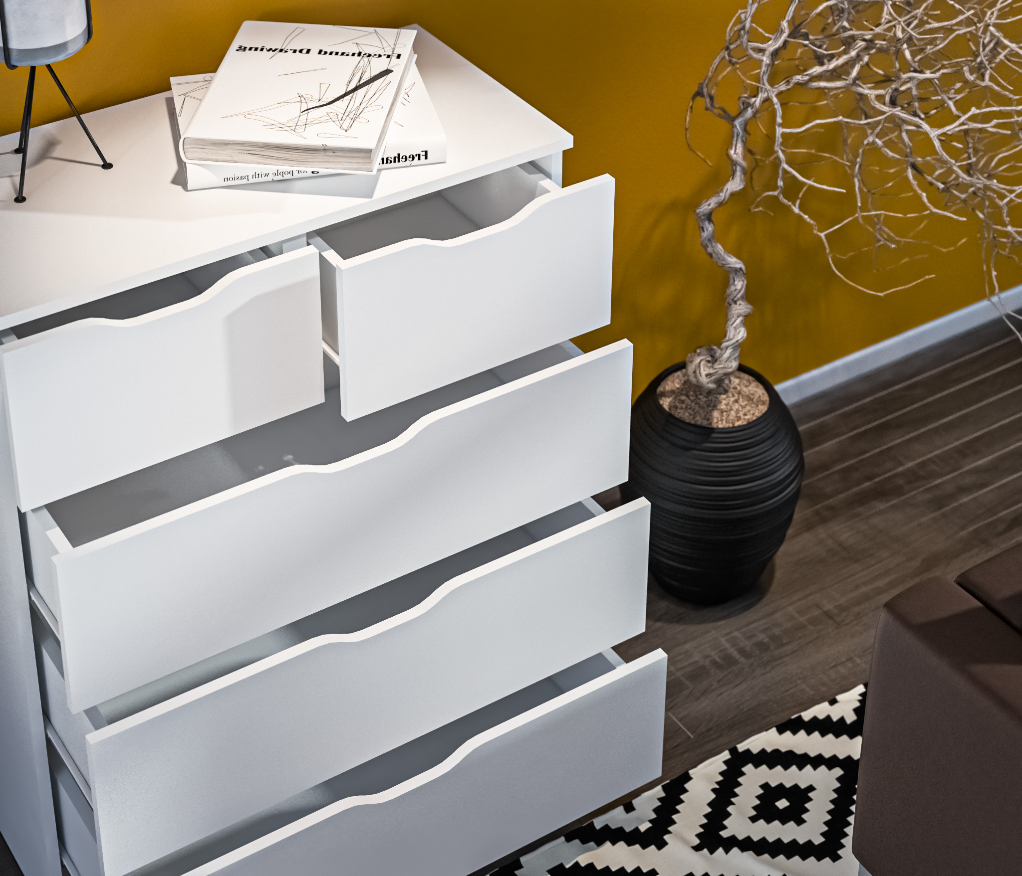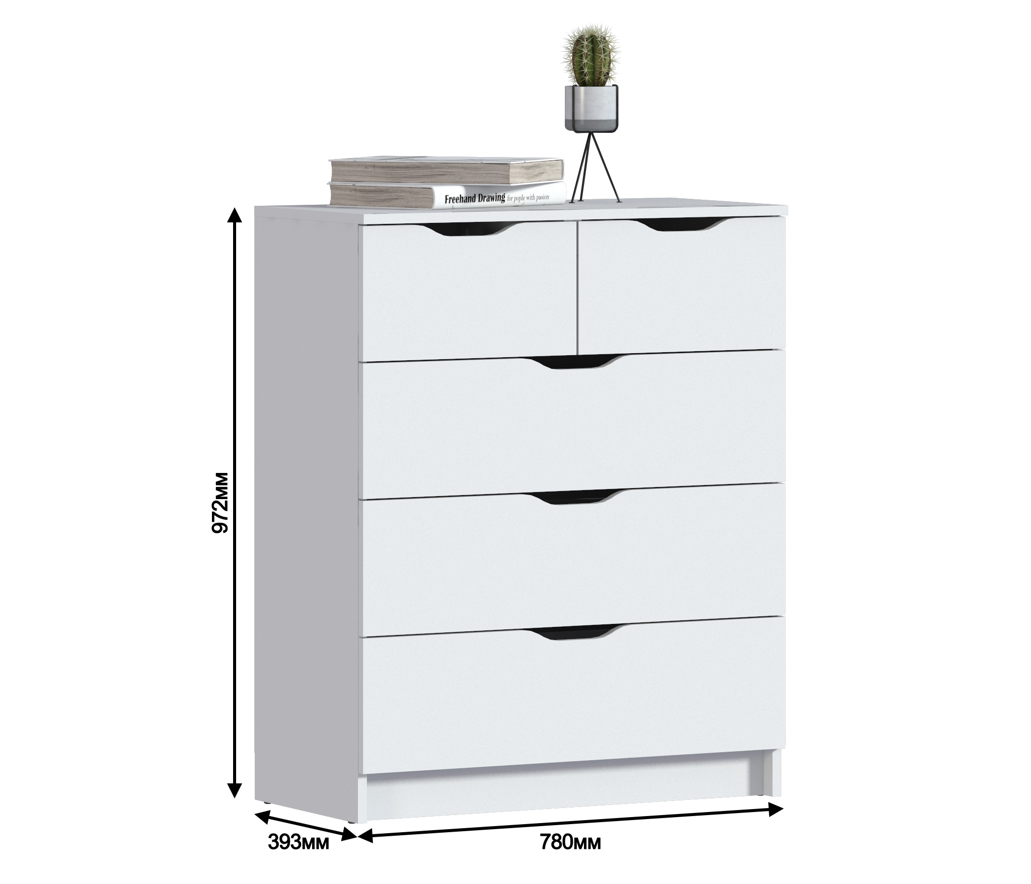 Комод имеет пять вместительных ящика.