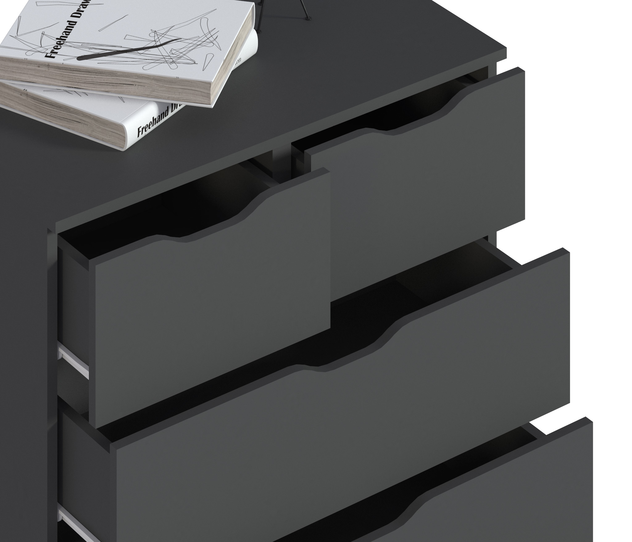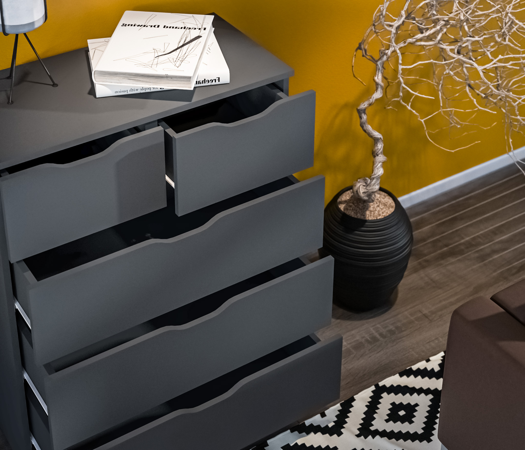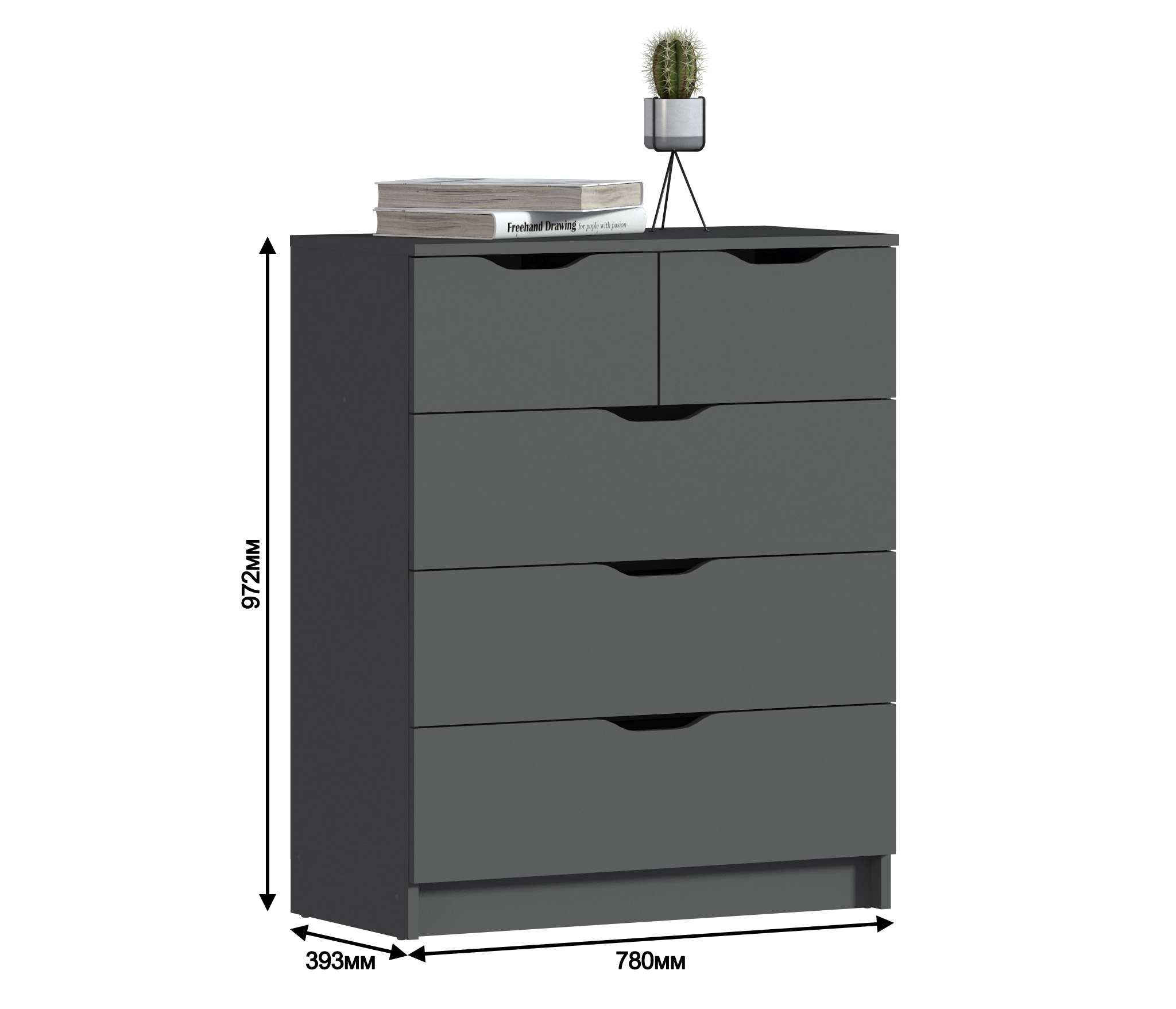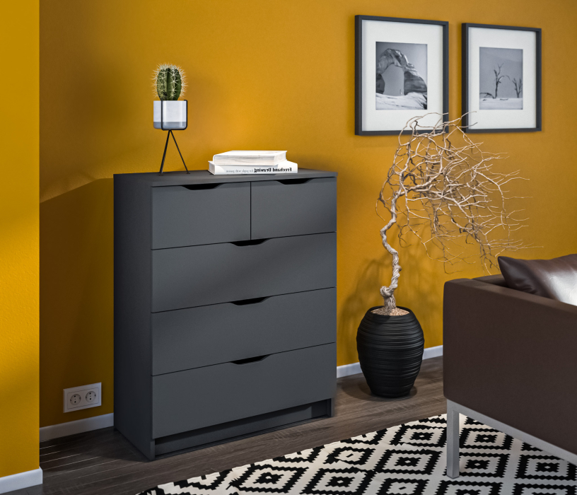 Комод имеет пять вместительных ящика.