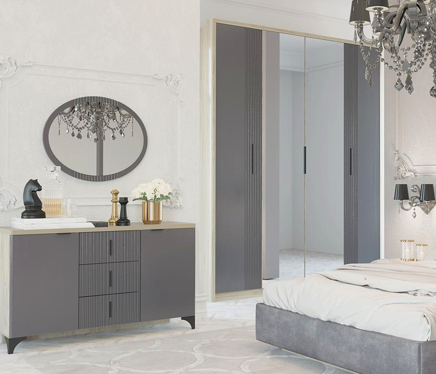 Настенное зеркало из серии Шер овальной формы для спальни, комплектуется отдельно.