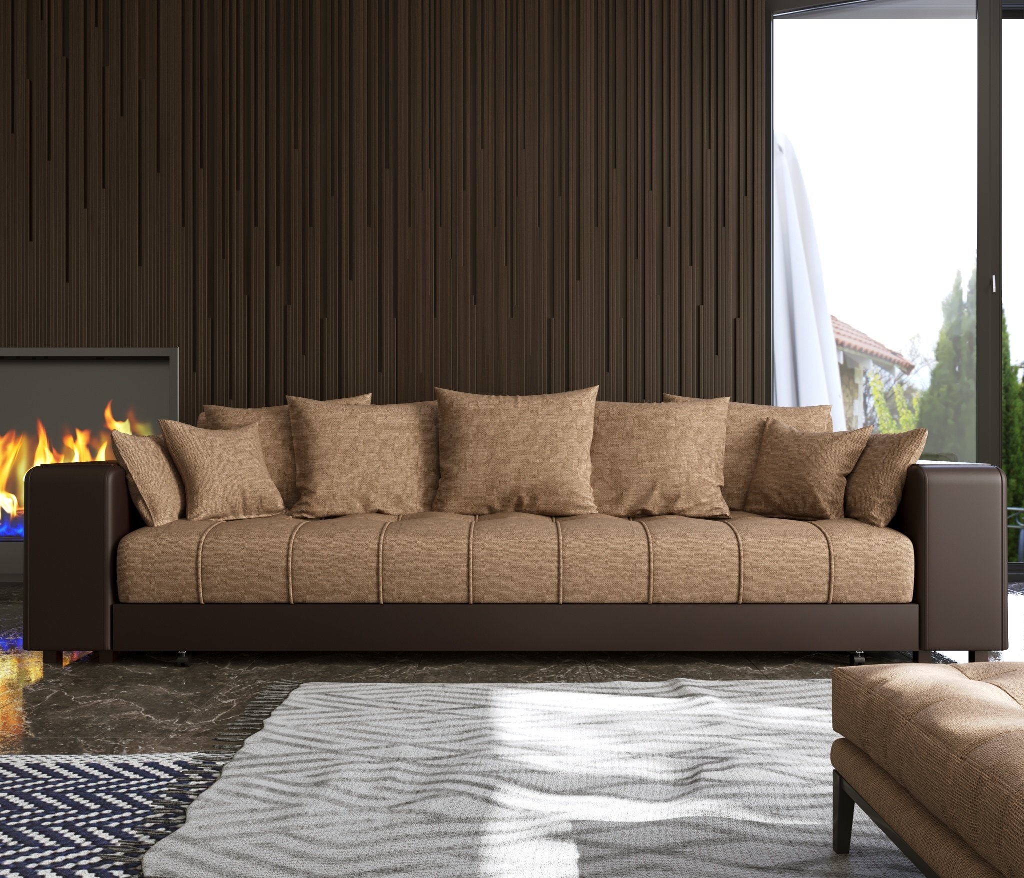 Прямой диван Дубай это отличный выбор для тех, кто планирует создать уют в своей квартире. Модель имеет выдержанный дизайн без элементов, которые перегружают её. С каждой стороны в подлокотниках установлены полки, куда вы сможете складывать различные мелочи, пульт итд.