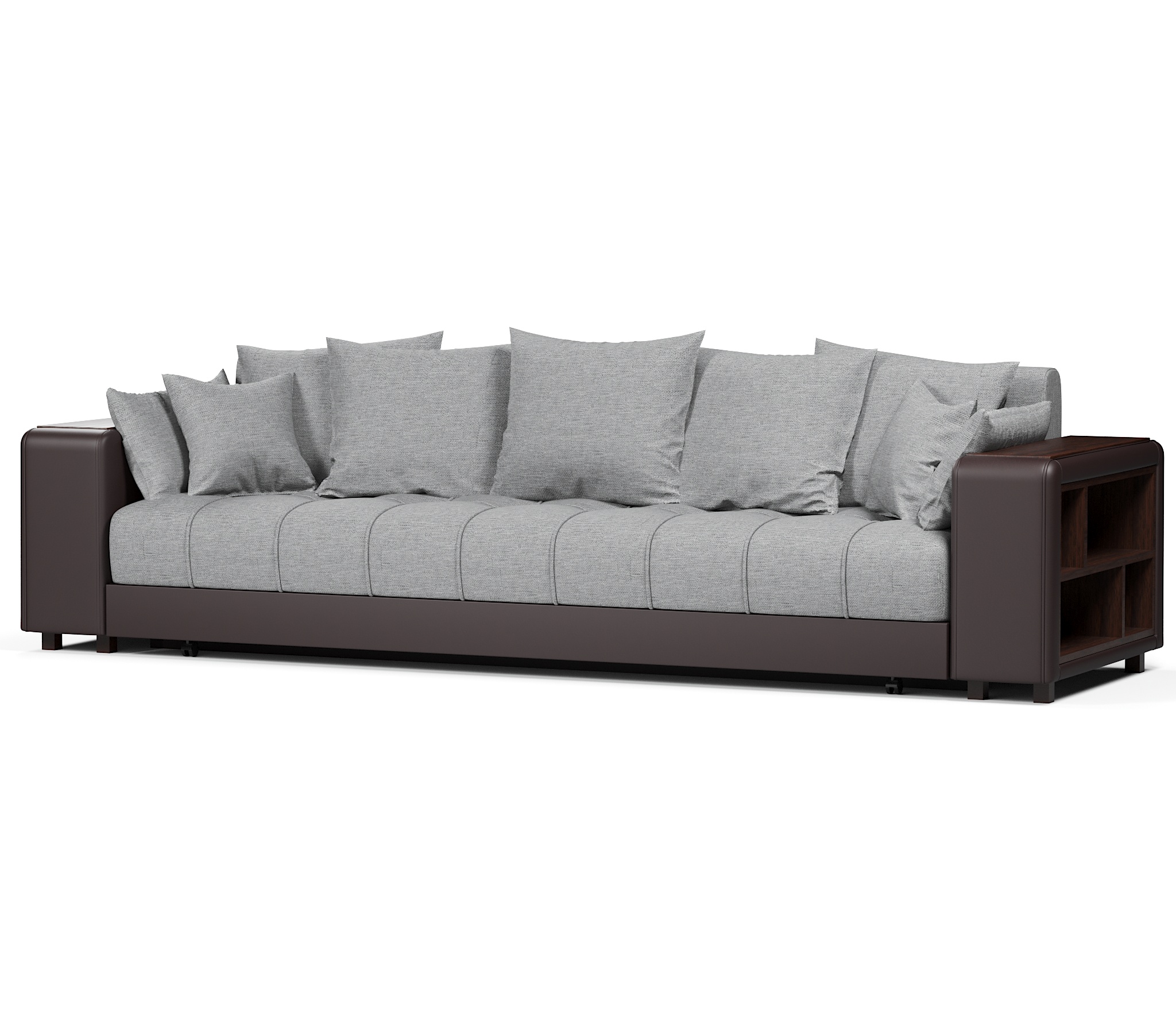 Прямой диван Дубай это отличный выбор для тех, кто планирует создать уют в своей квартире. Модель имеет выдержанный дизайн без элементов, которые перегружают её. С каждой стороны в подлокотниках установлены полки, куда вы сможете складывать различные мелочи, пульт итд.