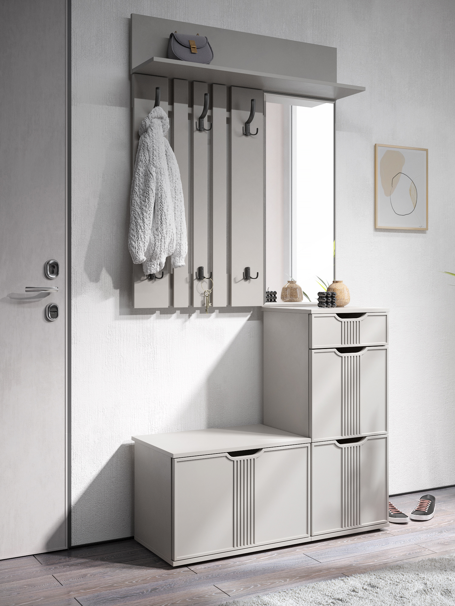 Вешалка Эмилия ЭЛ-6 компактна и функциональна, поэтому органично дополнит любой интерьер вашей прихожей. Вешалка состоит из нескольких объединенных панелей лдсп, трех двойных и трех тройных крючков, благодаря чему на ней можно с легкостью разместить верхнюю одежду нескольких человек. Крючки металлические, максимальная допустимая нагрузка до 15 кг на один крючок. Сочетая вешалку с другими модулями из коллекции Эмилия, Вы можете создать стильную и лаконичную прихожую у себя дома.