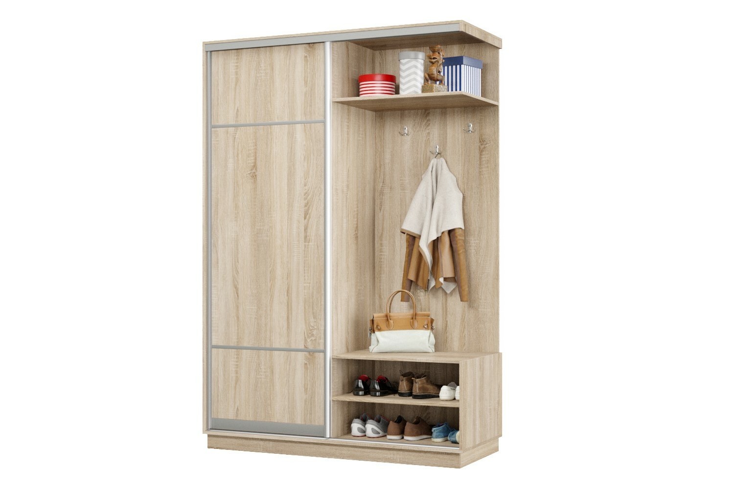 Дверь делит шкаф на 2 равные части: отделение для верхней одежды и отделение с полками и крючками.