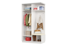 Дверь делит шкаф на 2 равные части: отделение для верхней одежды и отделение с полками и крючками.