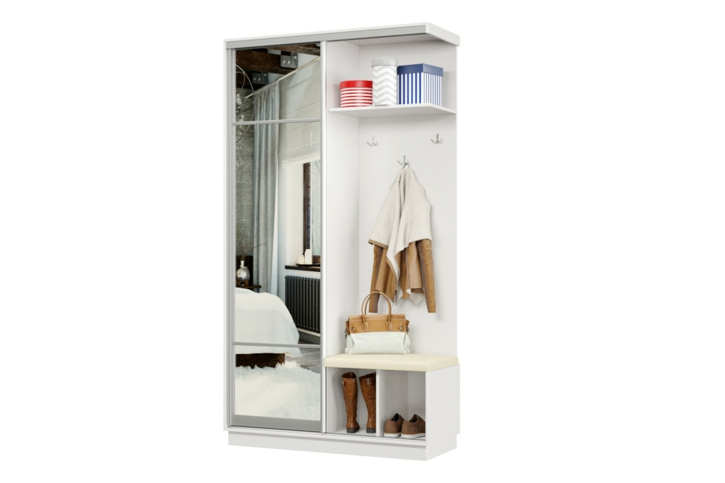 В прихожей используется одна дверь, которая перемещается по однополосному треку вправо или влево, закрывая или открывая каждую из двух частей шкафа.