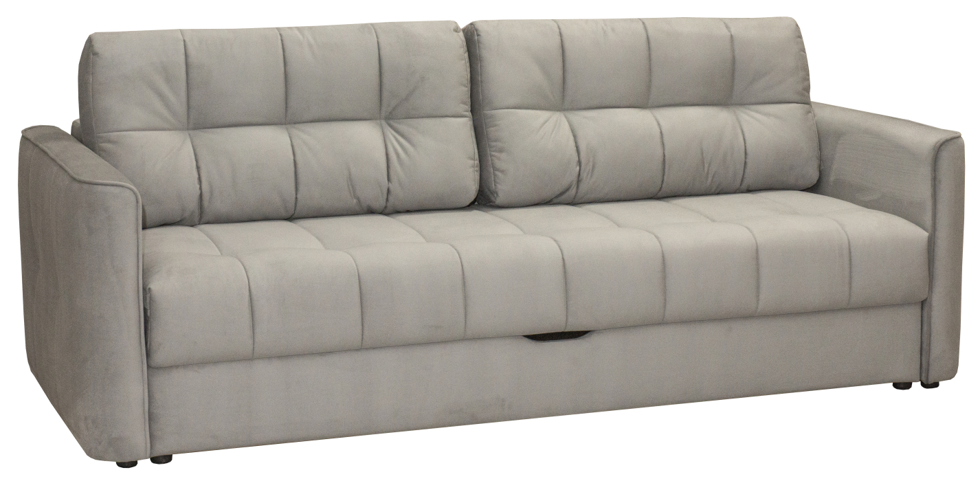 Радиусные углы «сглаживают» изделие. Спальное место легко трансформируется в большую удобную кровать – механизм трансформации «Тик-Так» удобный и лёгкий в эксплуатации. Сиденье создано по технологии «Split Foam». Наполнитель изготовлен из рассечённой анатомической пены, соединённой в несколько слоёв. Сиденье средней жёсткости. Ортопедическое основание «Birch battens» - средней гибкости, на основе берёзовых лат. Идеально подходит для анатомических моделей.