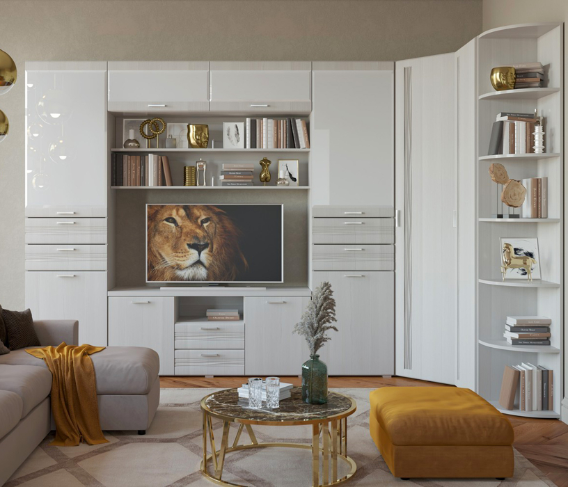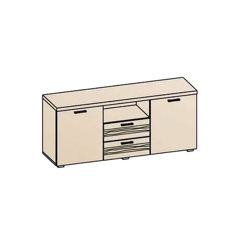 Трёхсекционная тумба из комплекта модульной гостиной Лотос, менее глубокий вариант. Слева и справа – тумбочки, по центру – открытая полка и выдвижные ящики. На фасаде выдвижных ящиков – фрезерованная МДФ. Ручка 96 мм. Регулируемые опоры L-20.