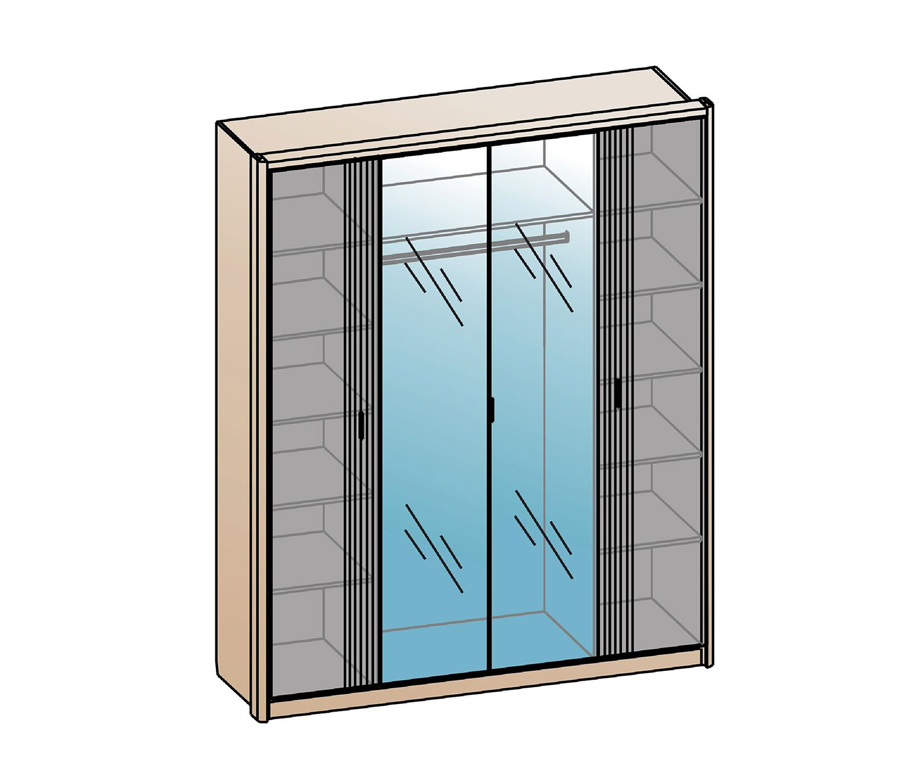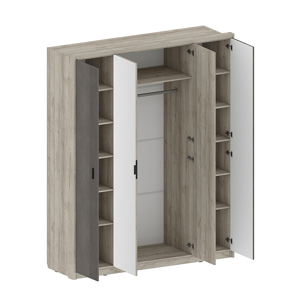 Шкаф Шер ШК-2307 4-х дверный, фасад шкафа декорирован зеркалами с обработкой фацет. Высота шкафов составляет 2330 мм, а полезная глубина 568 мм. Изготовлен из материала ЛДСП 16 мм, задняя стенка из ХДФ. Фасады из МДФ 16 мм под пленкой ПВХ — Дуб серый и Айронвуд серебро