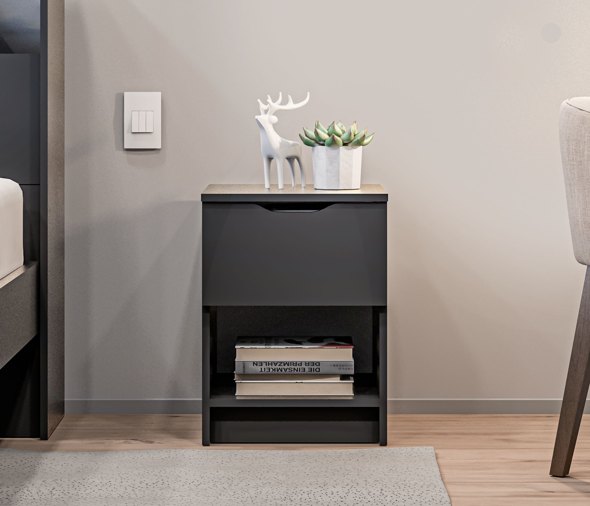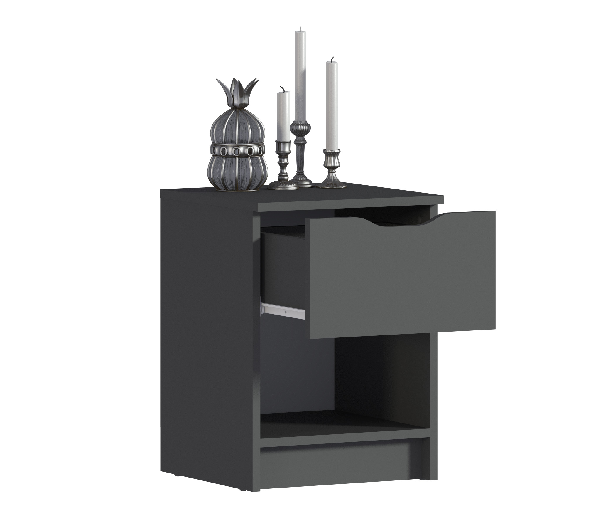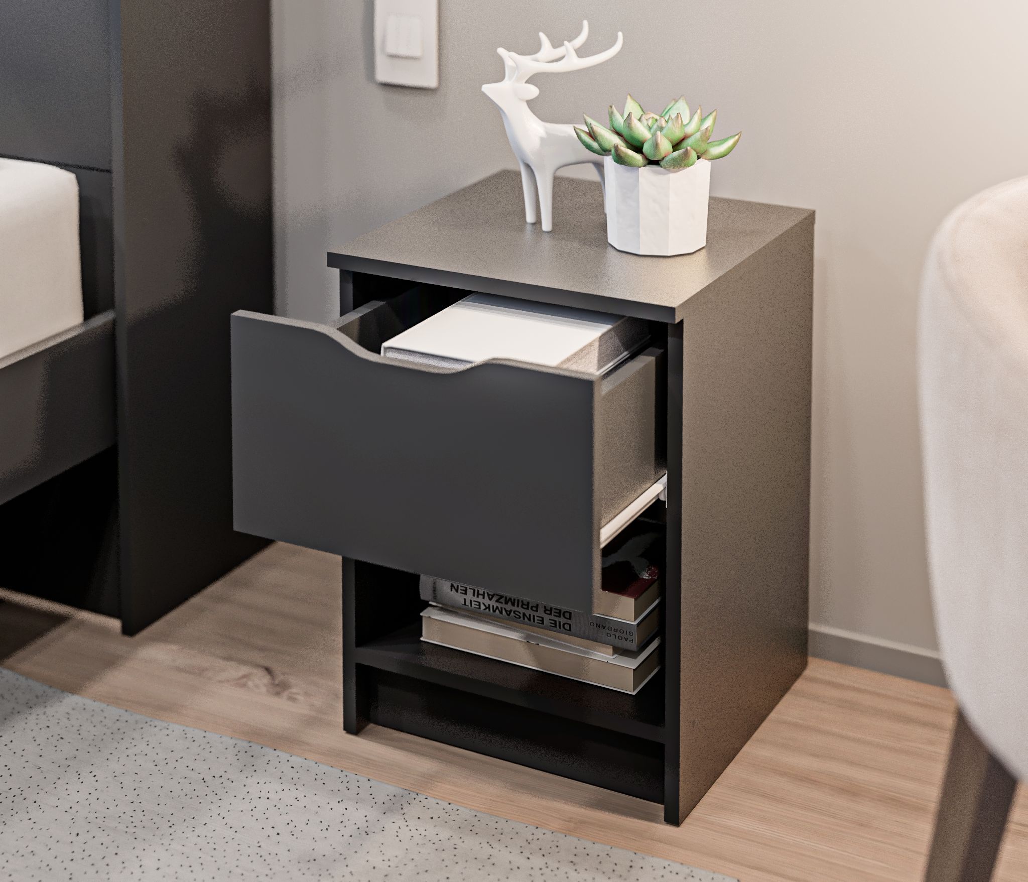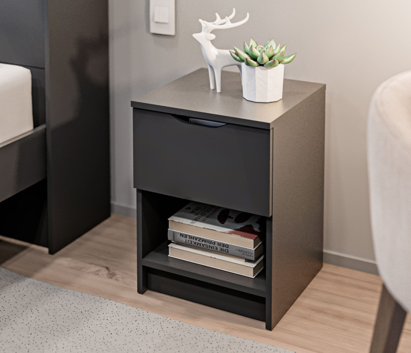 У тумбы есть один выдвижной ящик, который позволяет хранить различные предметы. Также имеется открытая полка, которая идеально подходит для размещения книг, журналов или других предметов, которые хотите иметь под рукой перед сном или по утрам.