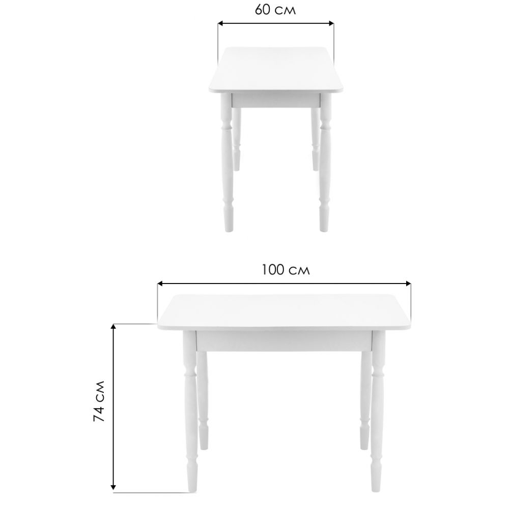 Расстояние между ножками по ширине: 45 см. Материал каркаса - Массив дерева; Материал ножек - Массив дерева; Материал столешницы - ЛДСП; Цвет каркаса - Белый; Цвет ножек - Белый; Цвет столешницы - Белый; Цвет подстолья - Белый; Ширина - 60; Высота - 74; Длина - 100.