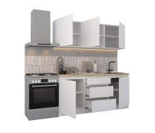 Кухня Леон состоит из нескольких модулей, включая шкаф-стол с ящиками под столовые приборы, обеспечивающий практичное и организованное хранение столовых приборов, посуды и других кухонных аксессуаров.